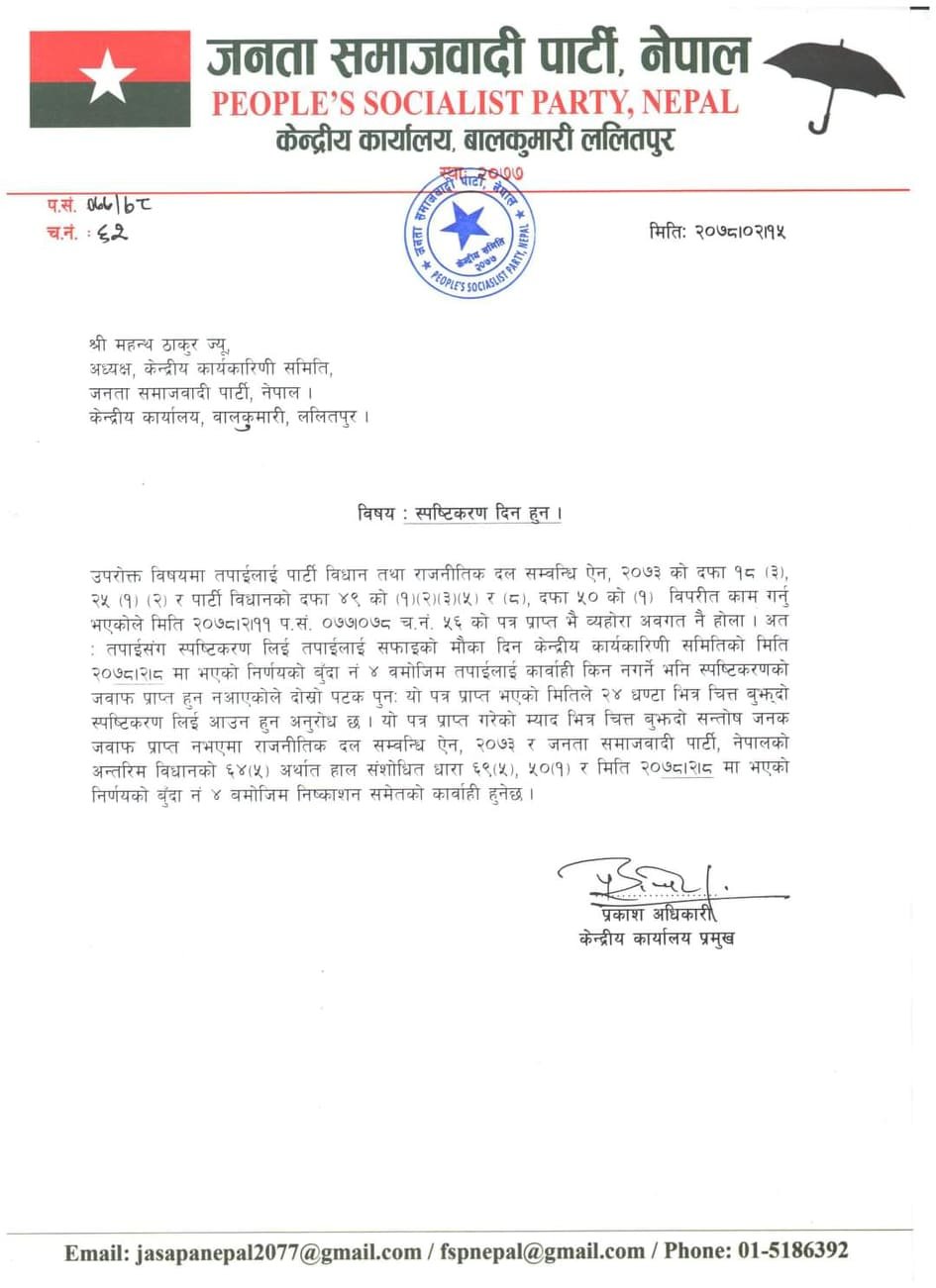 ठाकुरसहित वरिष्ठ नेता राजेन्द्र महतो, कार्यकारिणी सदस्यहरू लक्ष्मणलाल कर्ण र सर्वेन्द्रनाथ शुक्लालाई भट्टराई–यादव पक्षले स्पष्टीकरण सोधेको हो । यसअघिको स्पष्टीकरणको जवाफ नआएपछि चारै जनालाई २४ घण्टे स्पष्टीकरण सोधिएको यादव–भट्टराई पक्षको भनाइ छ ।
