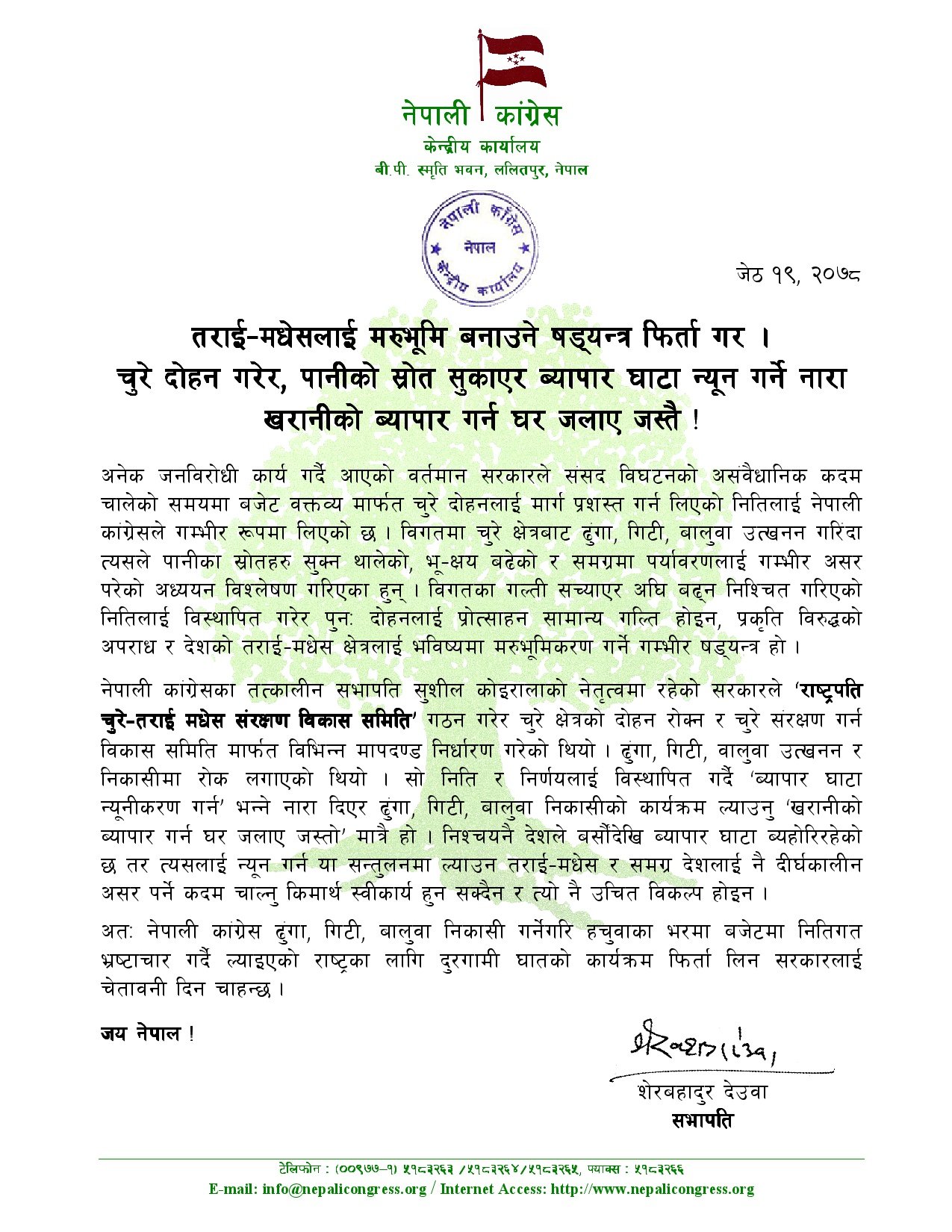 काठमाडौं । नेपाली कांग्रेसले तराई–मधेसलाई मरुभूमि बनाउने षड्यन्त्र फिर्ता गर्न सरकारलाई आग्रह गरेको छ । कांग्रेस सभापति शेरबहादुर देउवाले बुधबार विज्ञप्ति जारी गरी अनेक जनविरोधी कार्य गर्दै आएको वर्तमान सरकारले संसद विघटनको असंवैधानिक कदम चालेको समयमा बजेट वक्तव्यमार्फत चुरे दोहनलाई मार्ग प्रशस्त गर्न लिएको नीतिलाई नेपाली कांग्रेसले गम्भीर रूपमा लिएको बताएका छन् ।
