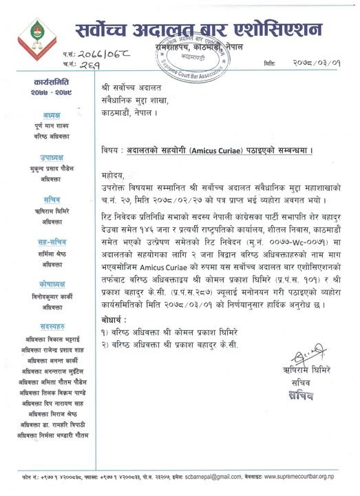 आदेशअनुसार सर्वोच्च बारले मुद्दामा राय दिन दुई कानुन व्यवसायीको नाम टुंगो लगाएको हो । सर्वोच्चको आदेशमा अदालतका सहयोगी एमिकस क्युरी लगायत निवेदक तथा प्रत्यर्थी तर्फका कानून व्यवसायीहरु (सरकारी वकिल सहित)लाई असार १० गतेभित्र लिखित बहस नोट पेश गर्न पनि भनिएको छ।