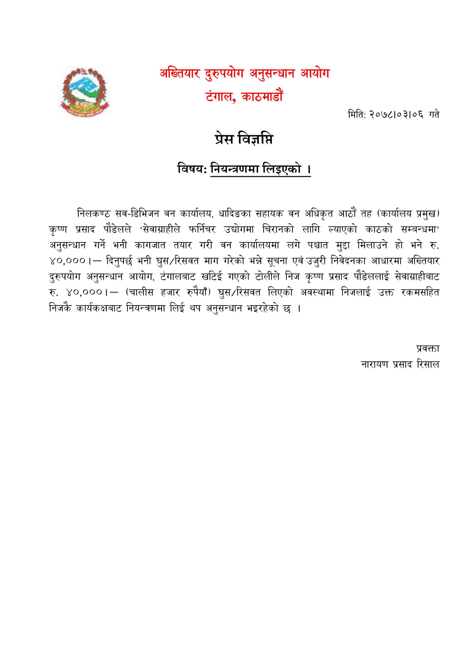 सेवाग्राहीले फर्निचर उद्योगमा चिरानको लागि ल्याएको काठको सम्बन्धमा अनुसन्धान गर्ने भनी कागजात तयार गरी वन कार्यालयमा लगेपछि मुद्दा मिलाउनका लागि घुस रकम माग गरेको अख्तियारले जनाएको छ ।