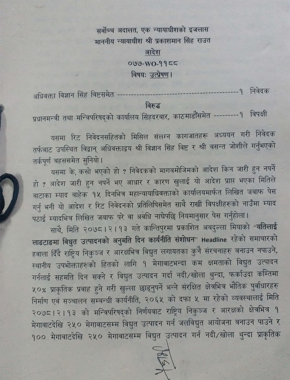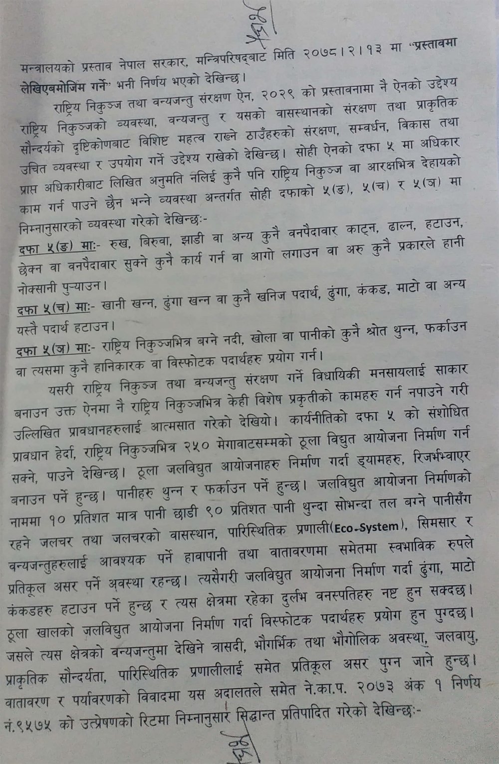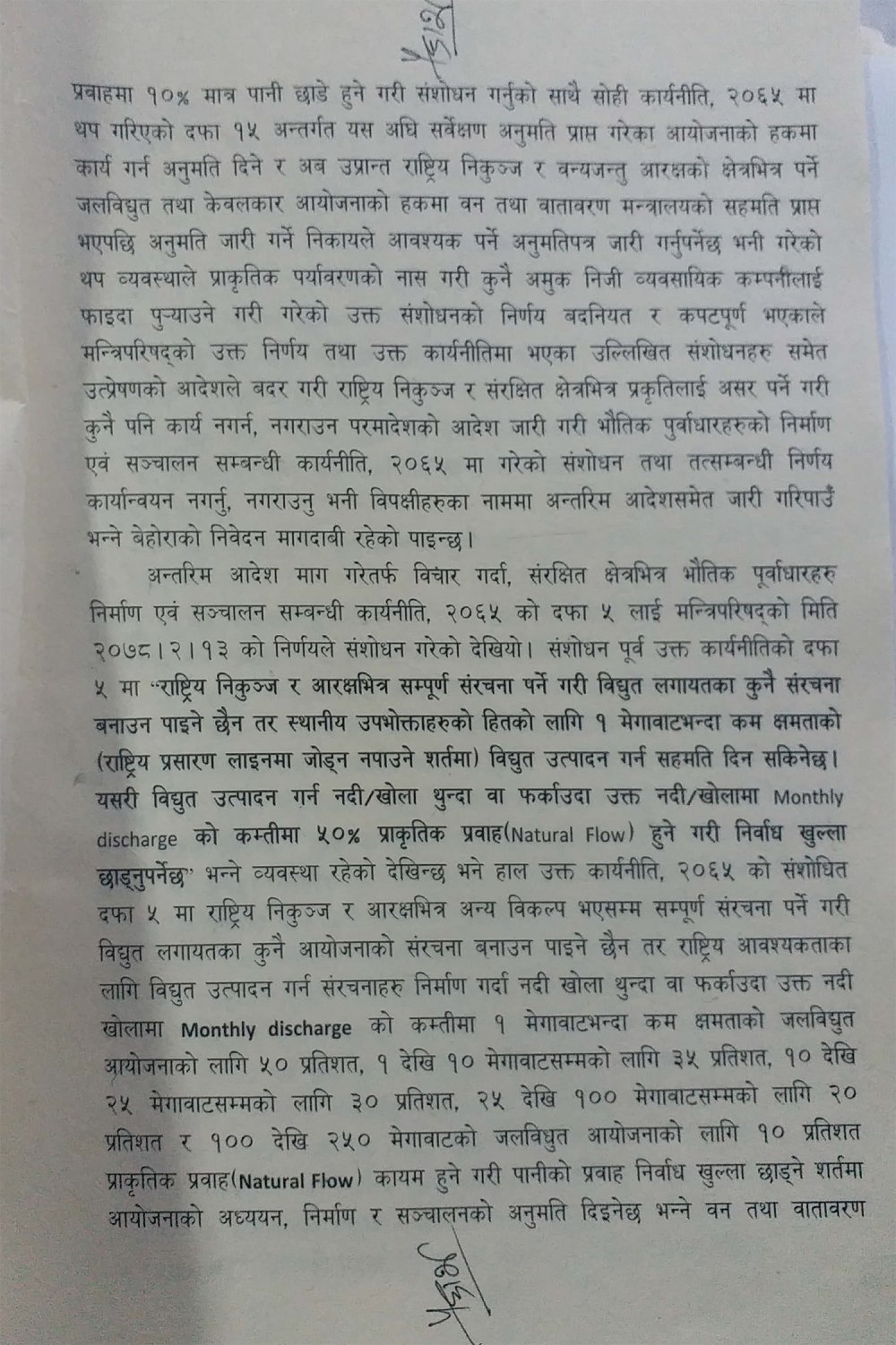 आदेशमा निकुञ्ज, आरक्षभित्र त्यसरी विद्युत् उत्पादन गर्न दिँदा निकुञ्ज ऐन विपरीत हुने र वन्यजन्तु संरक्षणको संवेदनशीलतालाई असर पर्ने भनिएको छ । तत्कालीन वन तथा वातावरणमन्त्री प्रेमबहादुर आलेले यति वर्ल्ड इन्भेस्टमेन्ट कम्पनी प्रालिलाई लामटाङ निकुञ्जको भित्रि भागमा विद्युत् उत्पादनको अनुमति दिन मन्त्रिपरिषदबाट कार्यनीति नै संशोधन गराएका थिए ।