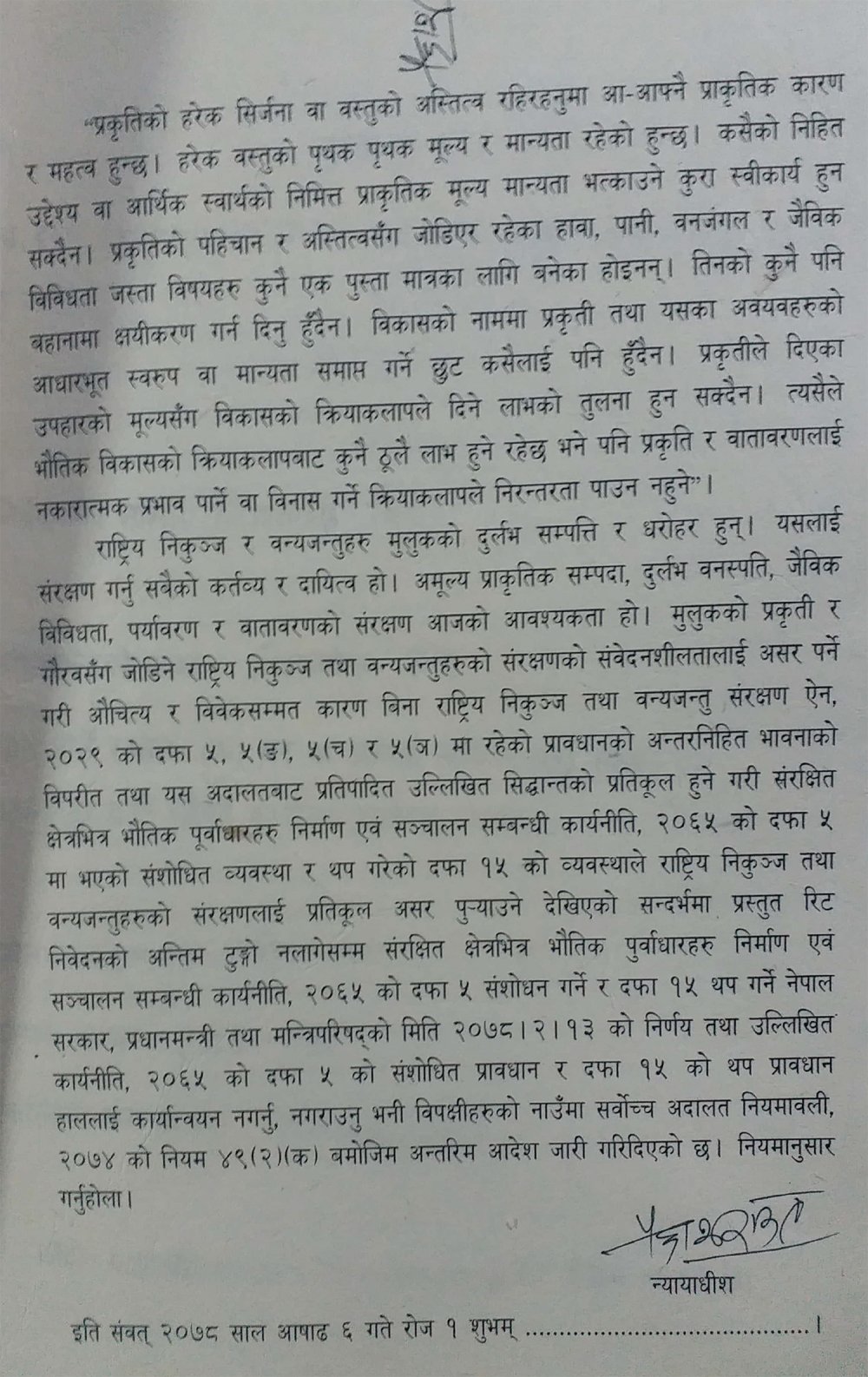 न्यायाधीश प्रकाशमानसिंह राउतको एकल इजालासले संरक्षित क्षेत्रभित्र भौतिक पूर्वाधार निर्माण एवं सञ्चालनसम्बन्धी कार्यनीति, २०६५ को दफा ५ संशोधन गर्ने र दफा १५ थप गर्ने मन्त्रिपरिषद्को जेठ १३ को निर्णय कार्यान्वयन नगर्न, नगराउन सरकारका नाममा अन्तरिम आदेश जारी गरेको हो । उक्त निर्णय खारेज माग गर्दै अधिवक्ता विज्ञानसिंह विष्टले सर्वोच्च अदालतमा रिट दायर गरेका थिए ।
