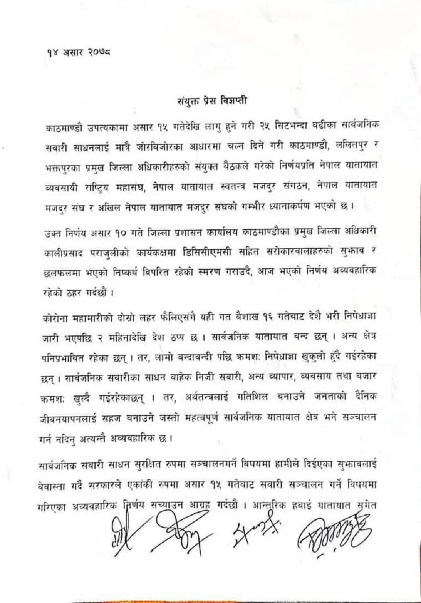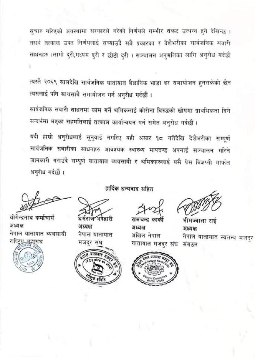 नेपाल यातायात व्यावसायी राष्ट्रिय महासंघ, नेपाल यातायात मजदुर संघ, अखिल नेपाल यातायात मजदूर संघ र नेपाल यातायात स्वतन्त्र मजदुर संगठनले संयुक्त विज्ञप्ति जारी गरी एकांकी निर्णय सच्यान माग गरेका हुन् ।