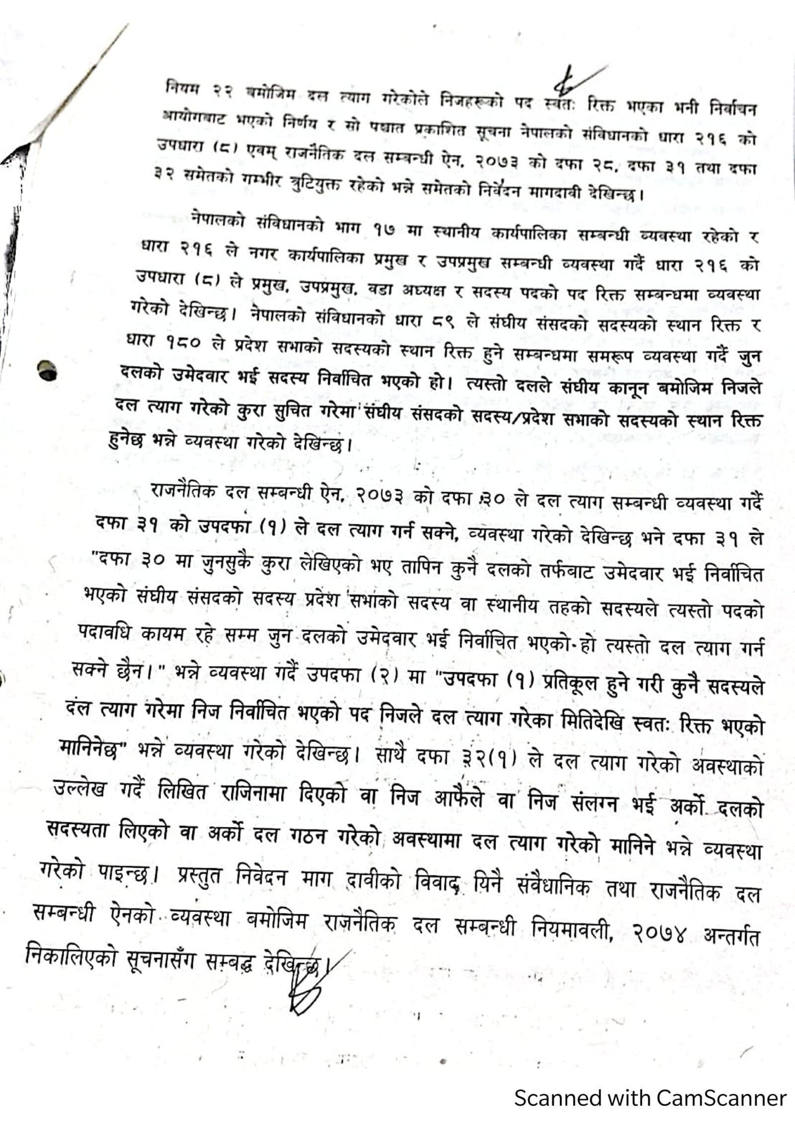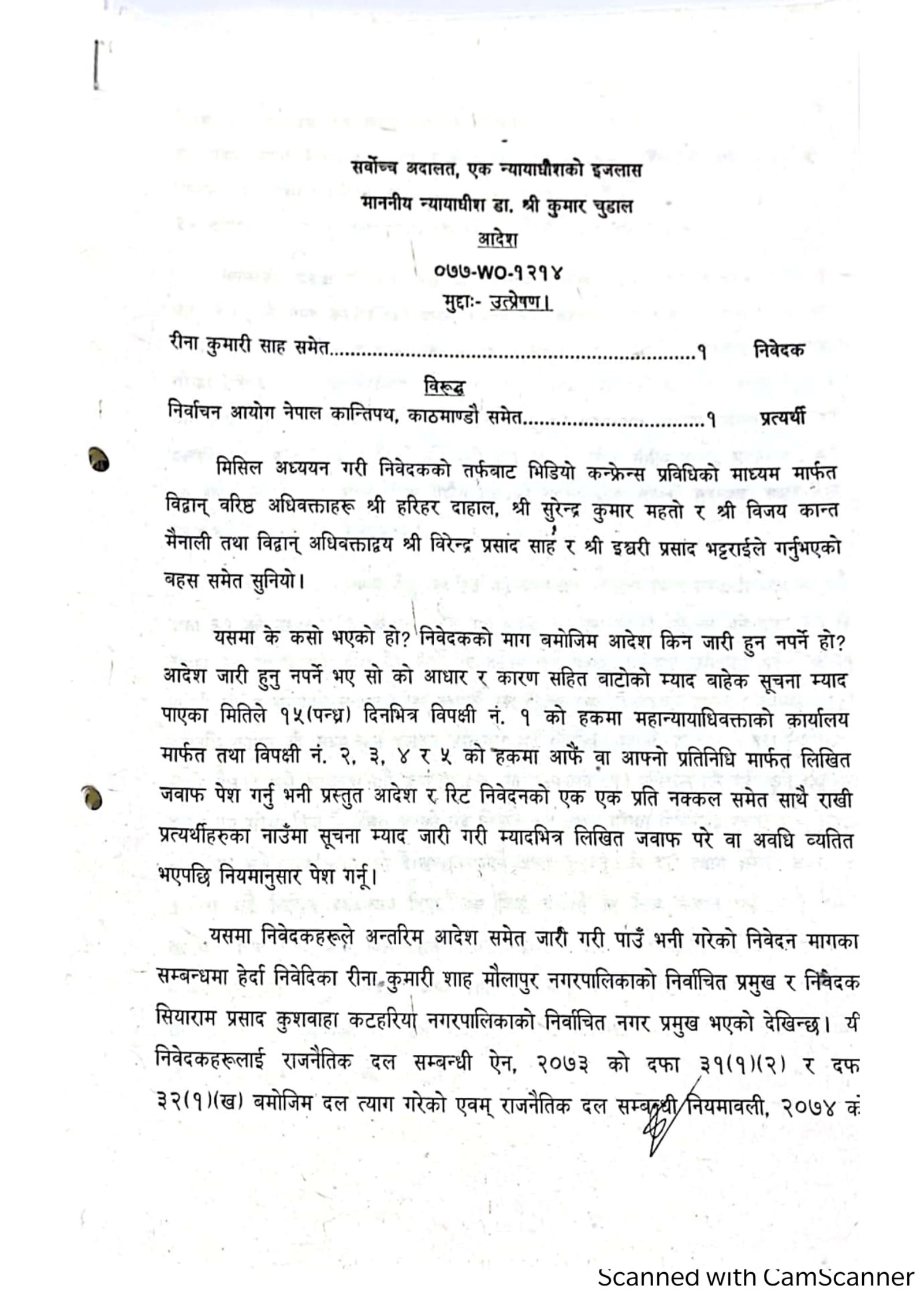 काठमाडौं । सर्वोच्च अदालतले रौतहटको मौलापुर नगरपालिकाकी मेयर रिनाकुमारी साह र कटहरिया नगरपालिकाका मेयर सियाराम कुशवाहलाई पदमुक्त गर्ने निर्वाचन आयोगको निर्णय तत्काल कार्यन्वयन नगर्न अन्तरिम आदेश दिएको छ ।