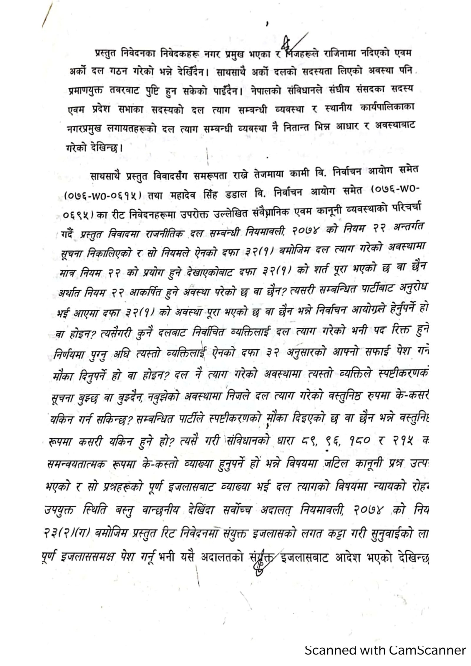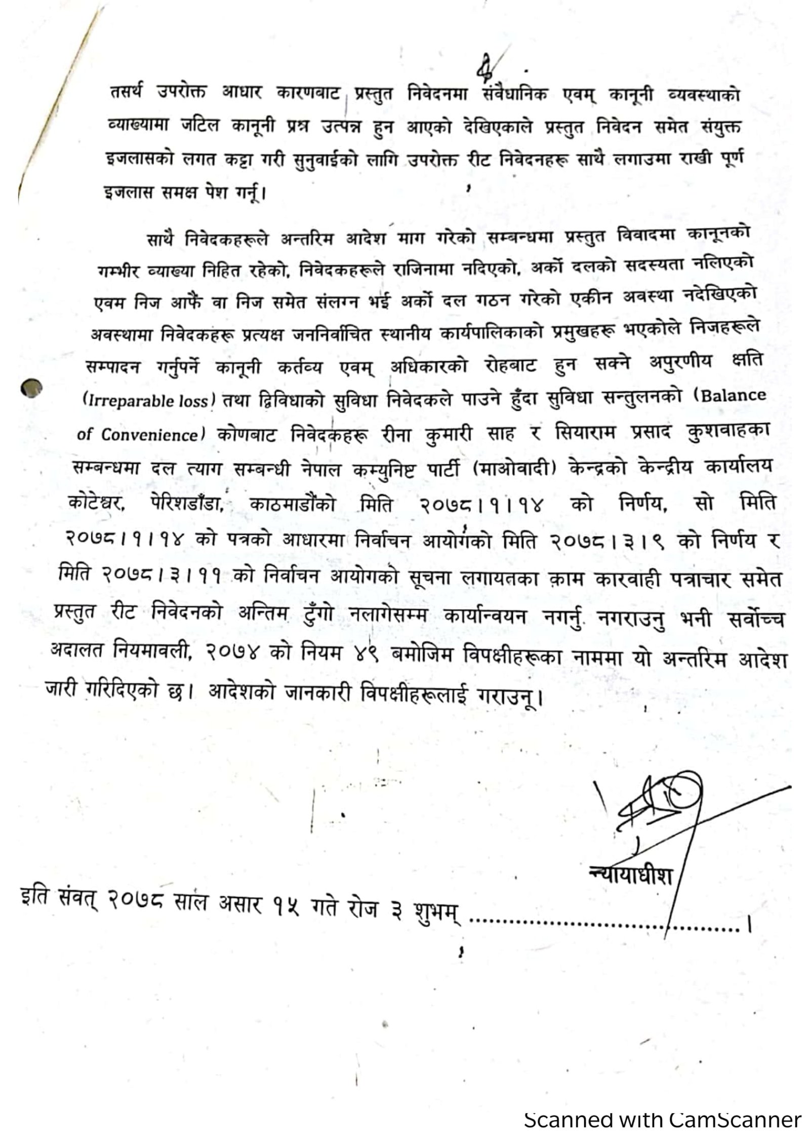मंगलबार सर्वाेच्चका न्यायाधीश कुमार चुँडालको एकल इजलासले साह र कुशवाहलाई कारबाही गर्ने निर्णय कार्यान्वयन नगर्न आदेश जारी गर्दै विपक्षीलाई १५ दिनभित्र लिखित जवाफ पेश गर्न भनेको छ । नेकपा (माओवादी केन्द्र) छाडेर अर्को दल गठन गरेको वा अर्को दलमा प्रवेश गरेको र राजीनामा दिएको यकिन नभएको भन्दै तत्काल निर्णय कार्यान्वयन नगर्ने भनेको हो ।