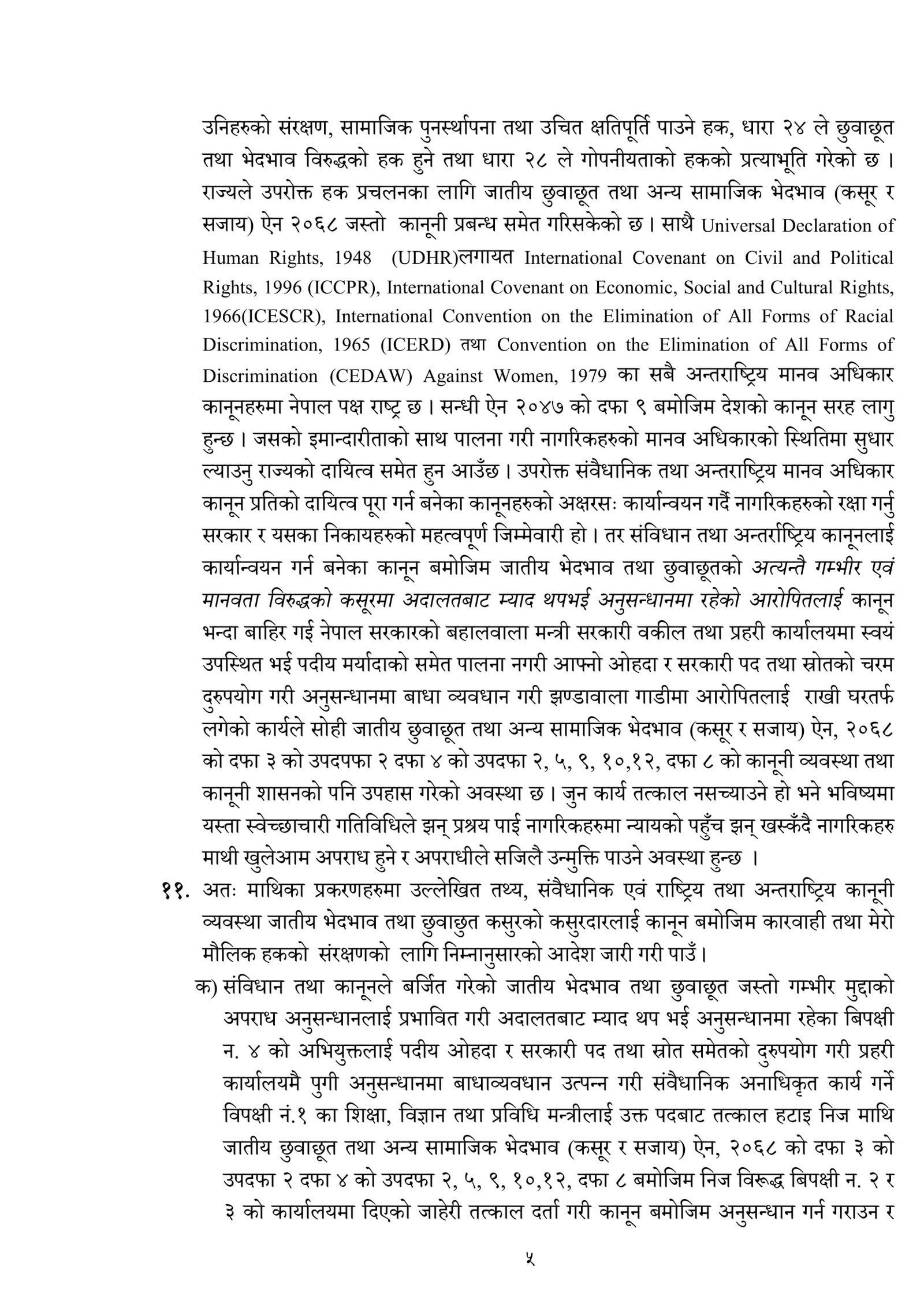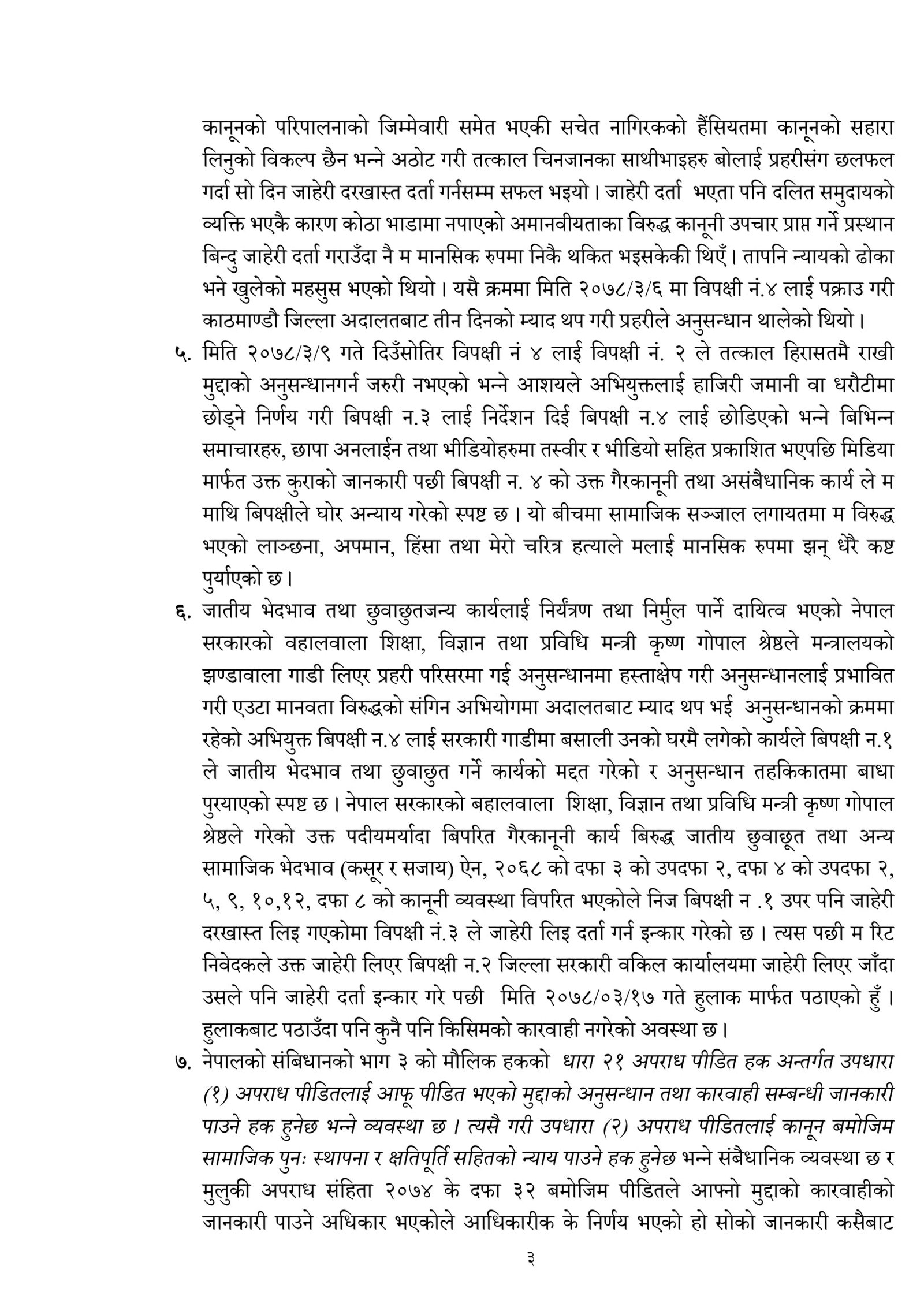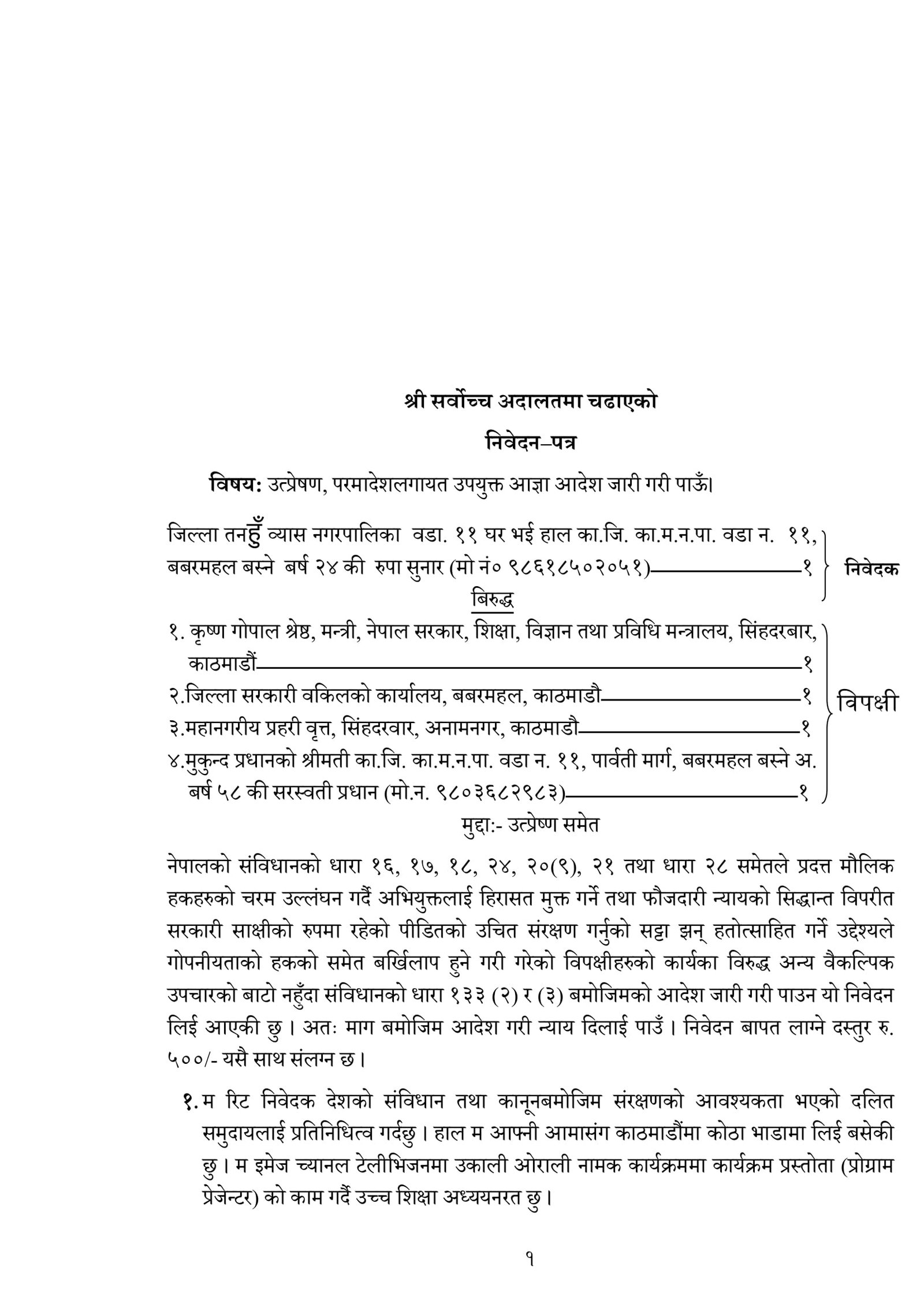 काठमाडौँ । जातीय भेदभाव तथा छुवाछुत कसुर आरोपमा कारबाहीको माग गर्दै शिक्षामन्त्री कृष्णगोपाल श्रेष्ठविरुद्ध सर्वोच्च अदालतमा रिट दर्ता भएको छ । तनहुँकी रुपा सुनारले आइतबार शिक्षामन्त्री श्रेष्ठविरुद्ध सर्वोच्चमा रिट दर्ता गराएकी हुन् ।