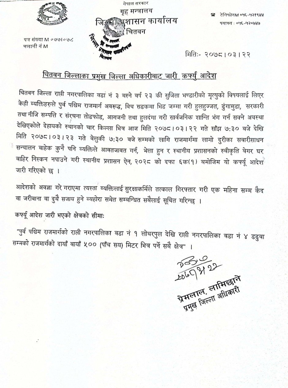 चितवनमा प्रमुख जिल्ला अधिकारी प्रेमलाल लामिछानेले पूर्व पश्चिम राजमार्गको राप्ती नगरपालिका–१ लोथरपुलदेखि राप्ती नगरपालिका–४ डढुवासम्मको राजमार्गको दाँयाबाँया ५०० मिटर क्षेत्रमा कर्फ्यू आदेश जारी गरेका छन् । प्रदर्शन बढ्दै गएपछि स्थितिलाई नियन्त्रणमा लिन कर्फ्यू आदेश जारी गरिएको प्रशासनले जनाएको छ ।
