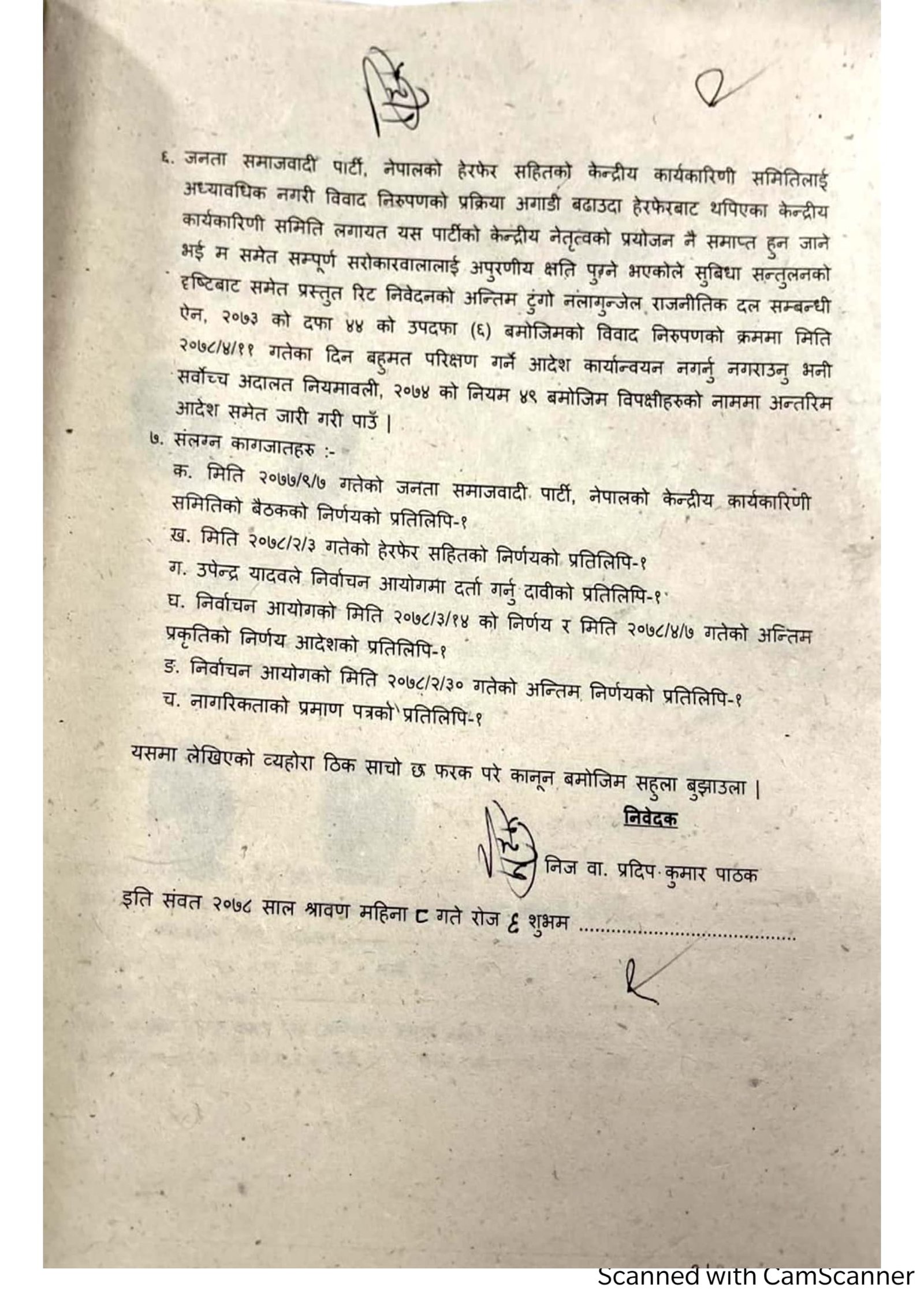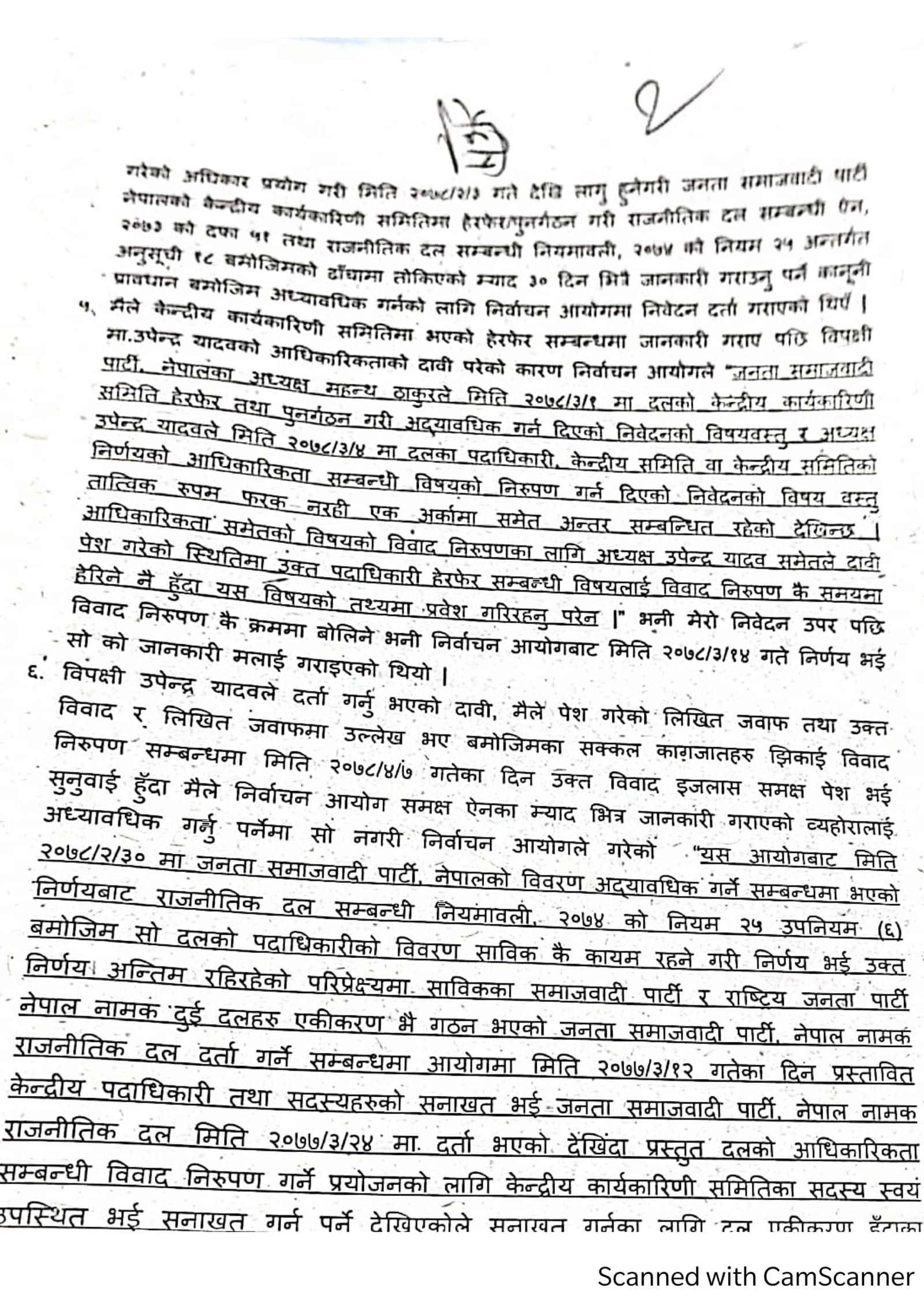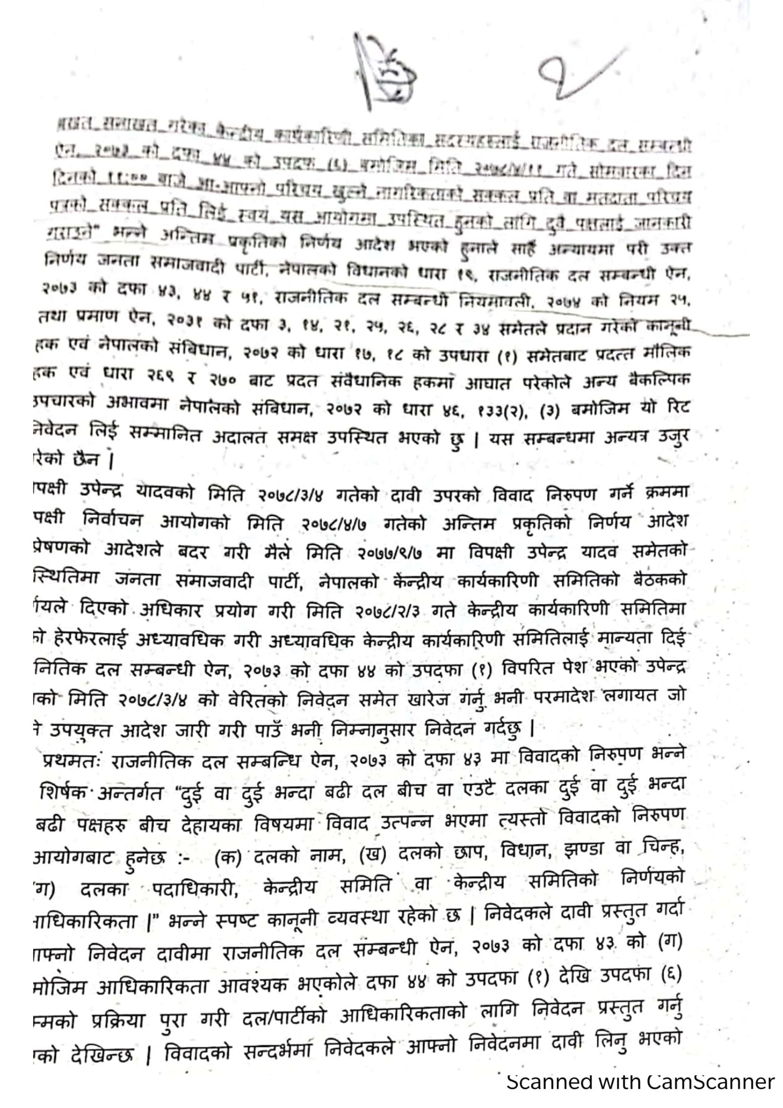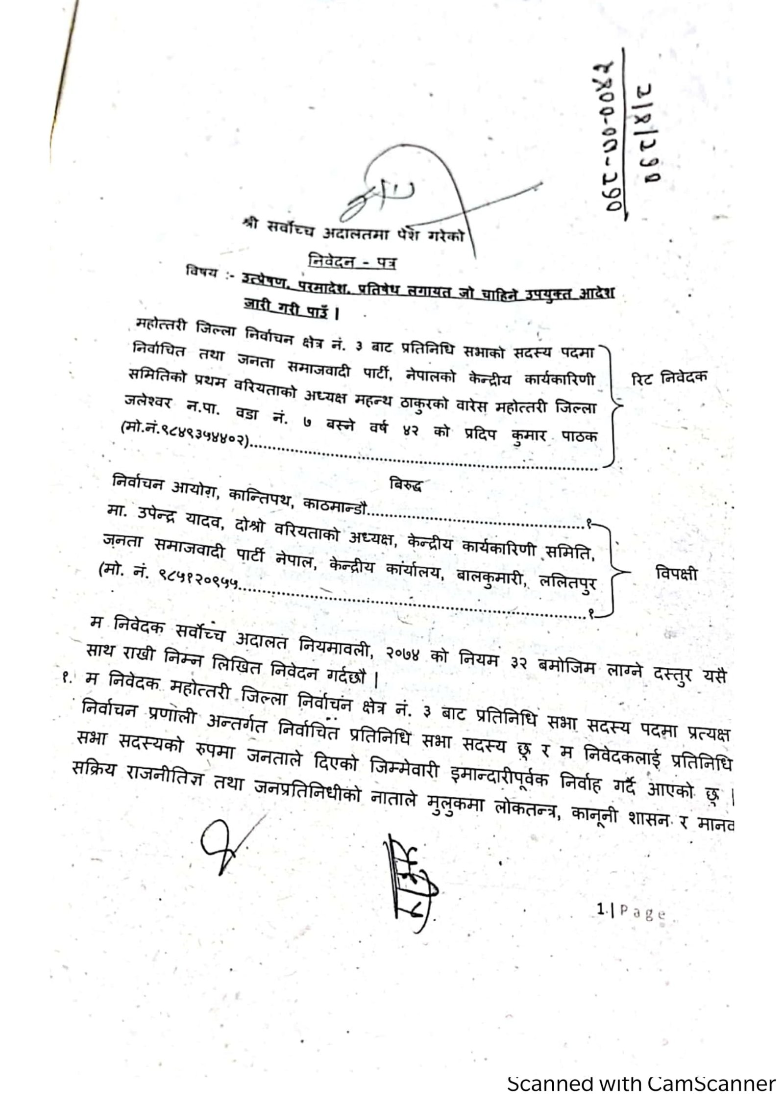 निर्वाचन आयोगले जसपा आधिकारिकता विवादको निर्क्योल साउन ११ गते केन्द्रीय कार्यकारिणी समितिका सदस्यहरूको सनाखतबाट गर्ने निर्णयविरुद्ध ठाकुर सर्वोच्च अदालत पुगेका हुन् । ठाकुरले वारेसमार्फत सर्वोच्च अदालतमा निर्वाचन आयोग र अध्यक्ष उपेन्द्र यादवलगायतलाई विपक्षी बनाएर शुक्रबार रिट निवेदन पेस गरेका छन् ।