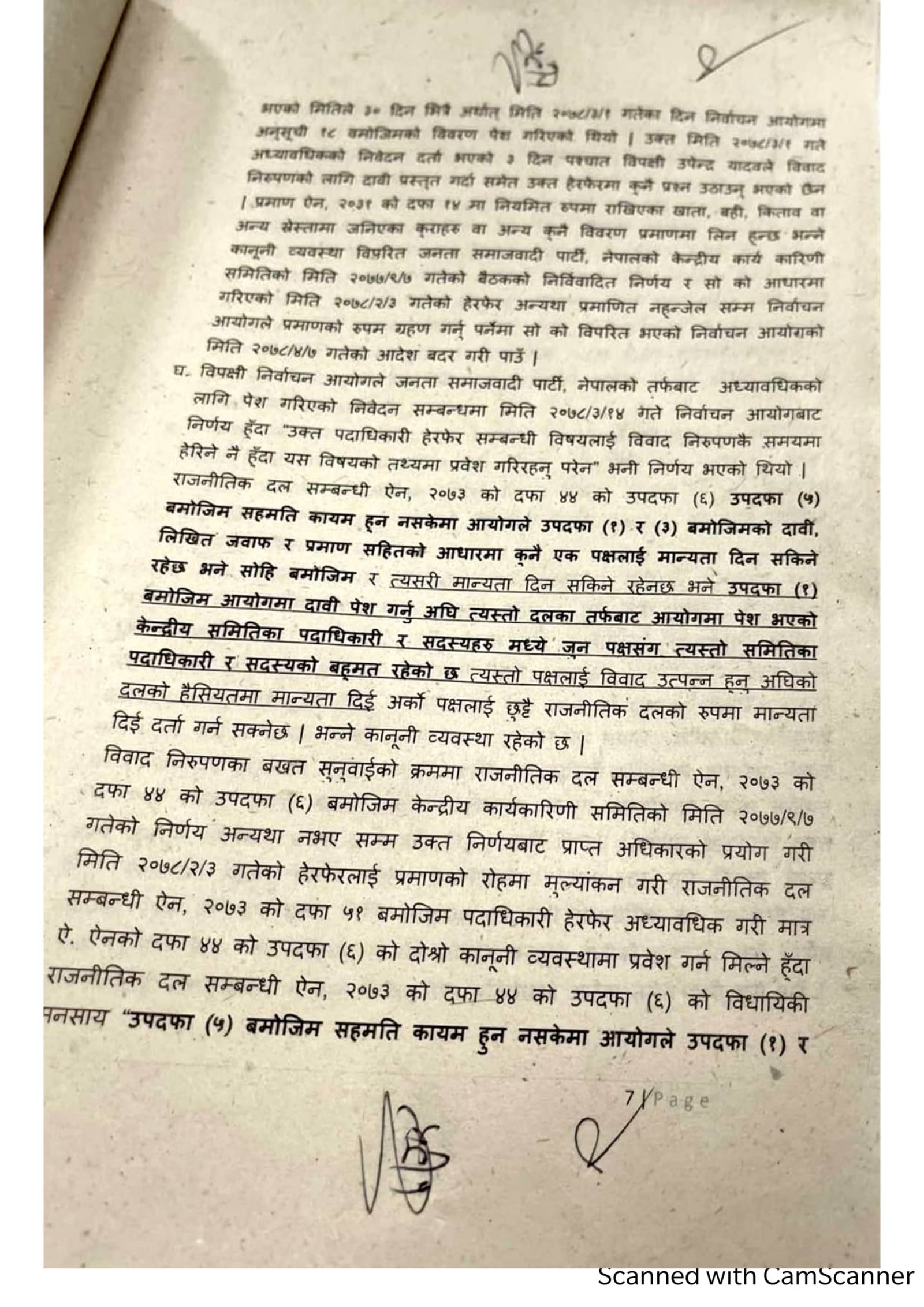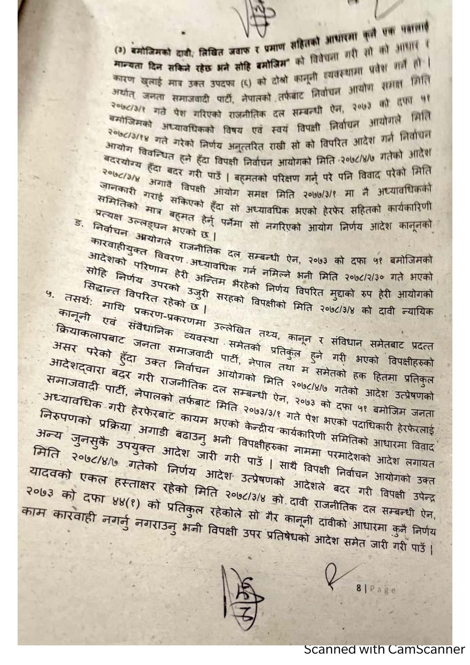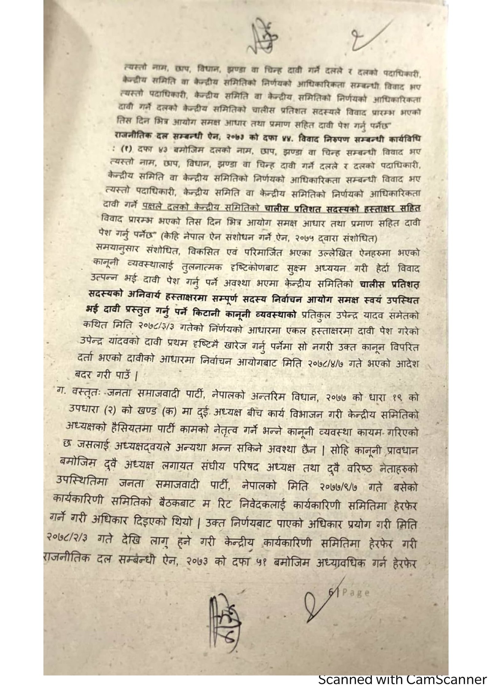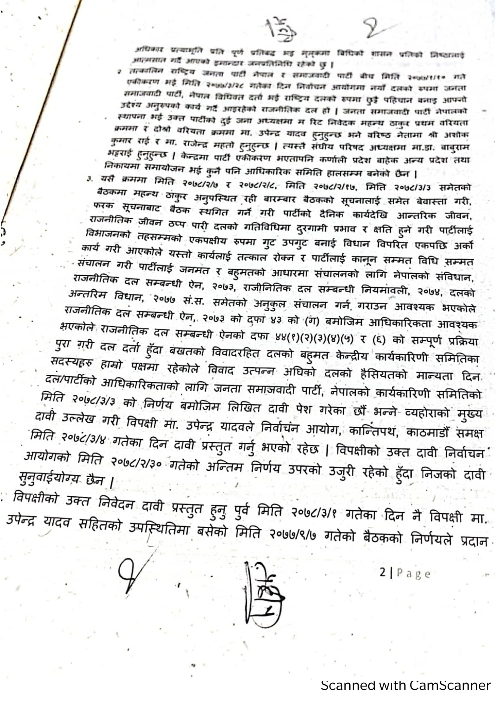 निर्वाचन आयोगले जसपा आधिकारिकता विवादको निर्क्योल साउन ११ गते केन्द्रीय कार्यकारिणी समितिका सदस्यहरूको सनाखतबाट गर्ने निर्णयविरुद्ध ठाकुर सर्वोच्च अदालत पुगेका हुन् । ठाकुरले वारेसमार्फत सर्वोच्च अदालतमा निर्वाचन आयोग र अध्यक्ष उपेन्द्र यादवलगायतलाई विपक्षी बनाएर शुक्रबार रिट निवेदन पेस गरेका छन् ।