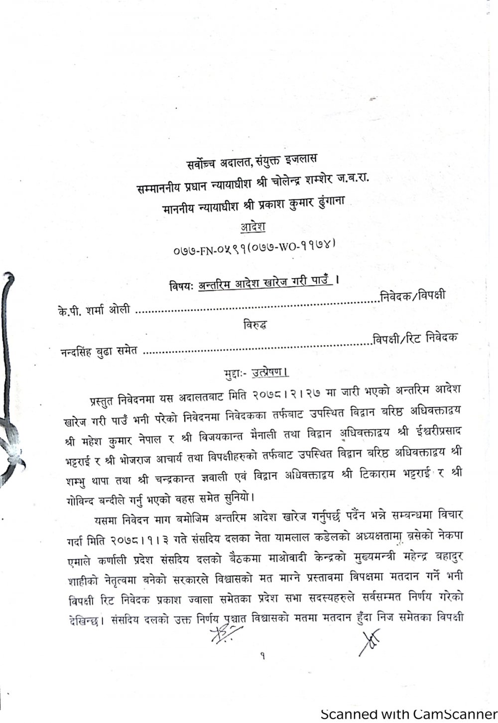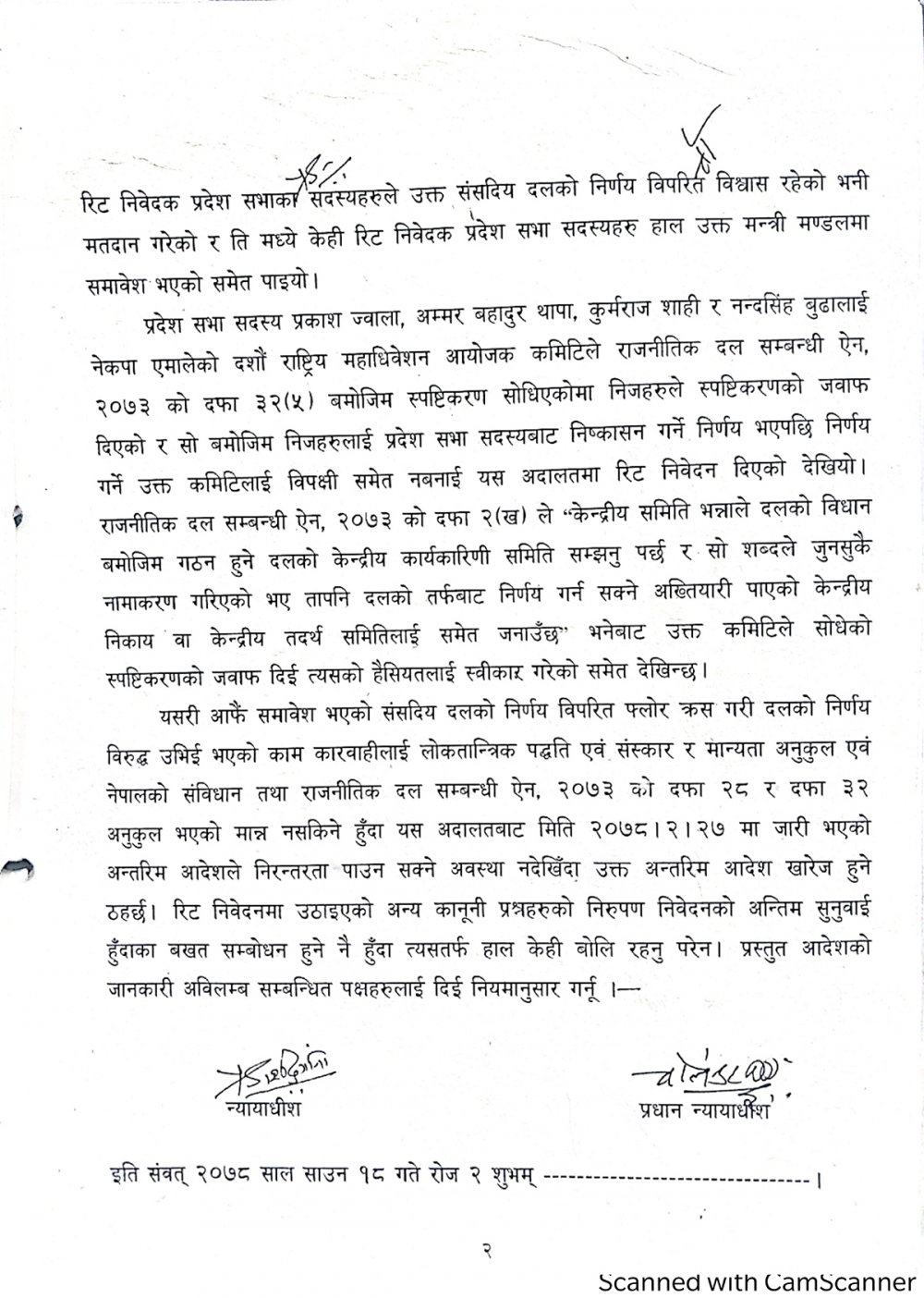 सोमबार प्रधानन्यायाधीश चोलेन्द्र शमशेर जबरा र न्यायाधीश प्रकाश ढुंगानाको संयुक्त इजलासले आफू आवद्ध संसदीय दलको निर्णयविपरीत फ्लोर क्रस गर्नु लोकतान्त्रिक पद्धति एवम् संस्कार र मान्यता अनुकूल नभएको ठहर गरेको हो ।