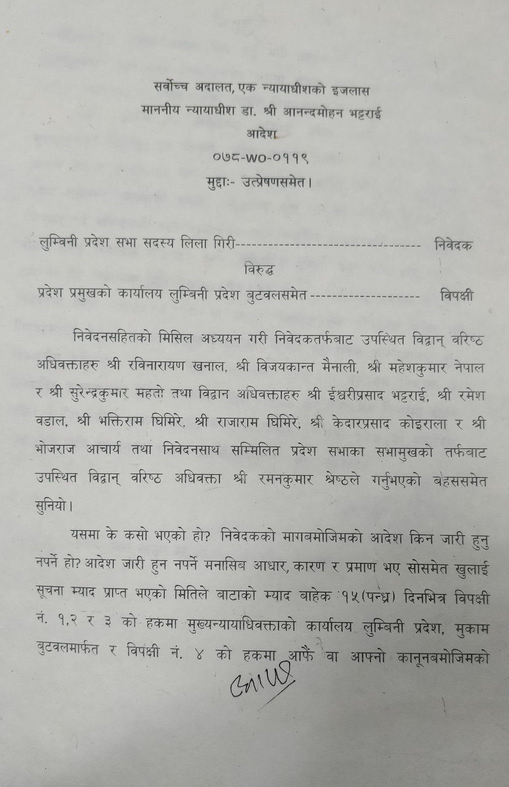 लुम्बिनी प्रदेशको विशेष अधिवेशनविरुद्धको रिटमा भएन अन्तरिम आदेश