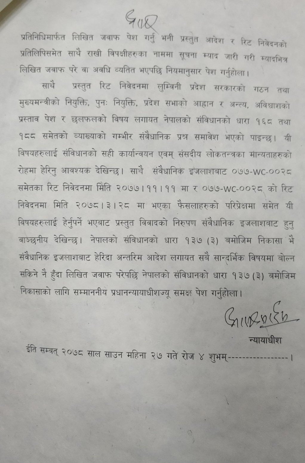 निवेदकको माग बमोजिम अदालतले अन्तरिम आदेश भने दिएन । यता, बुधबार लुम्बिनी प्रदेश सभा विशेष अधिवेशन सुरु भइसकेको छ भने त्यसअघि नै मुख्यमन्त्री पोखरेलले राजीनामा दिइसकेका छन्।