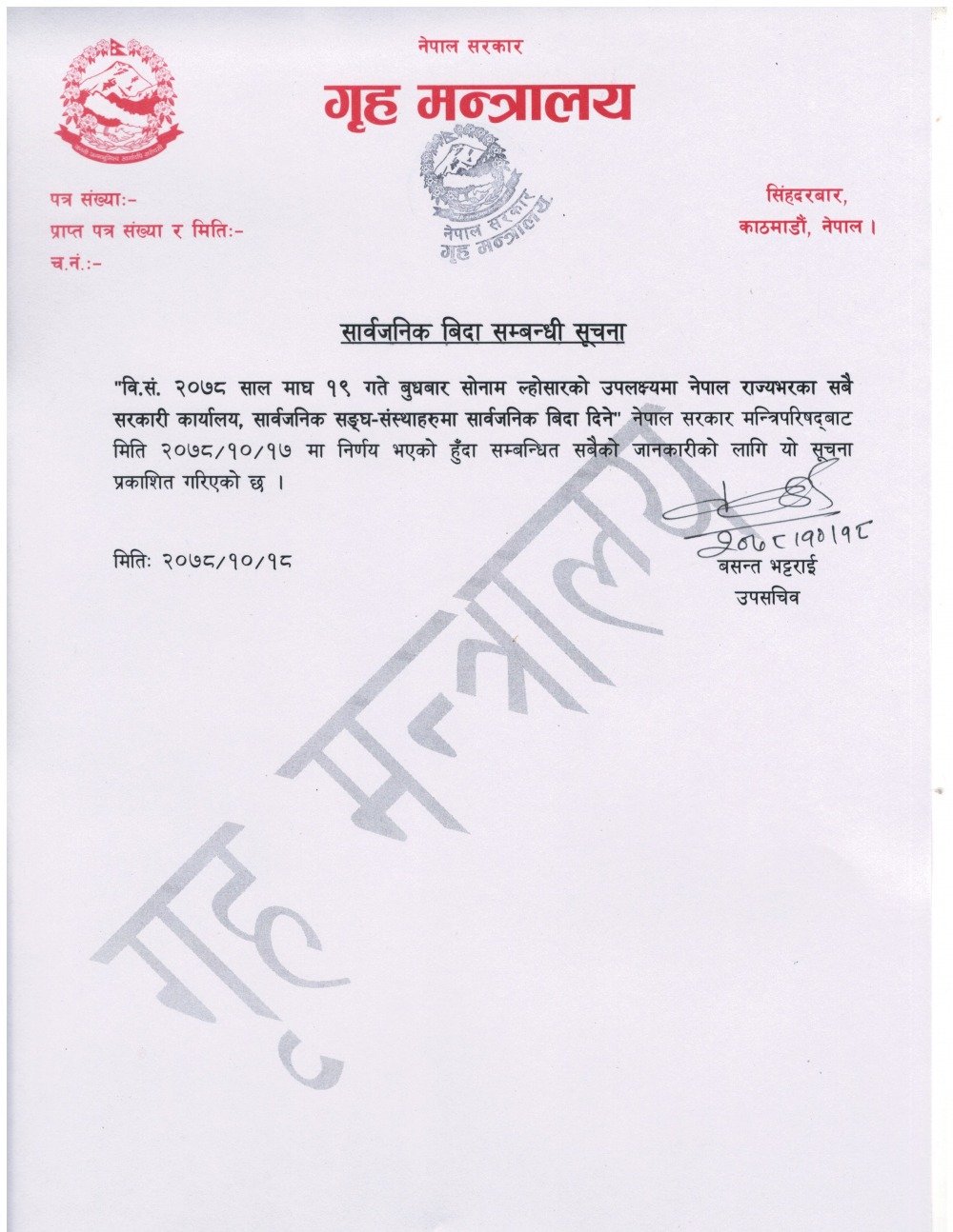 मन्त्रिपरिषद्को निर्णयपछि सरकारी कार्यालय, सार्बजनिक संघसंस्थाहरुमा सार्वजनिक बिदा दिने निर्णय भएको गृह मन्त्रालयले जारी गरेको विज्ञप्तिमा उल्लेख छ ।