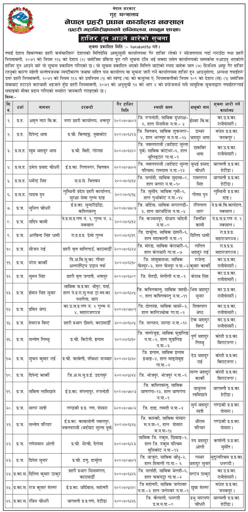 आफूखुसी गैरहाजिर रहेको र खोजतलास गराउँदा तथा प्रहरी नियमावली २०७१ को नियम ११५ को देहाय (२) बमोजिम प्रक्रिया पूरा गरी सूचना टाँस भइसक्दा समेत उनीहरू कार्यालयको सम्पर्कमा नआएको कार्यालयले जनाएको छ।