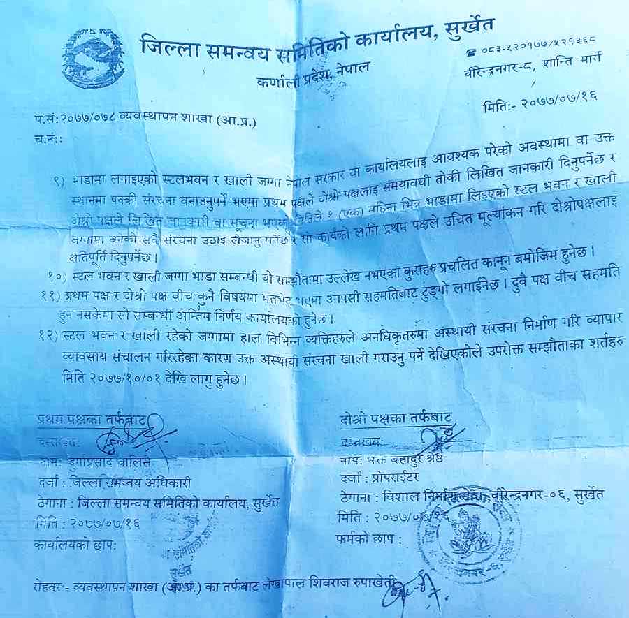 जिससले शनिबार ३५ दिने सूचना निकालेर भाडामा दिइएको ठाउँ खाली गर्न भनेको छ। सूचनामा सुर्खेत उपत्यका नगर विकास समितिले जग्गा फिर्ता मागेकाले खाली गरिदिन भनिएको छ।