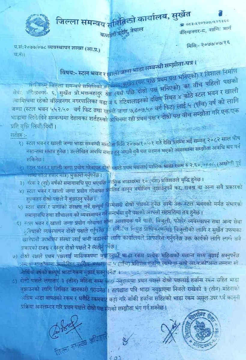 नगेन्द्र उपाध्याय, सुर्खेत । जिल्ला समन्वय समिति सुर्खेतले वीरेन्द्रनगर–६ स्थित गोदामलाइनको चार कोठे स्टल भवन र केही खाली जनिम पाँच वर्षका लागि भाडामा दिनका लागि सार्वजनिक सूचना आव्हान गर्‍यो। सोही अनुसार विशाल निर्माण सेवाले मासिक दुई लाख ६० हजार रुपैयाँमा २०७७ माघ एक गतेदेखि लागू हुने गरेर जिसससँग सम्झौता गर्‍यो।