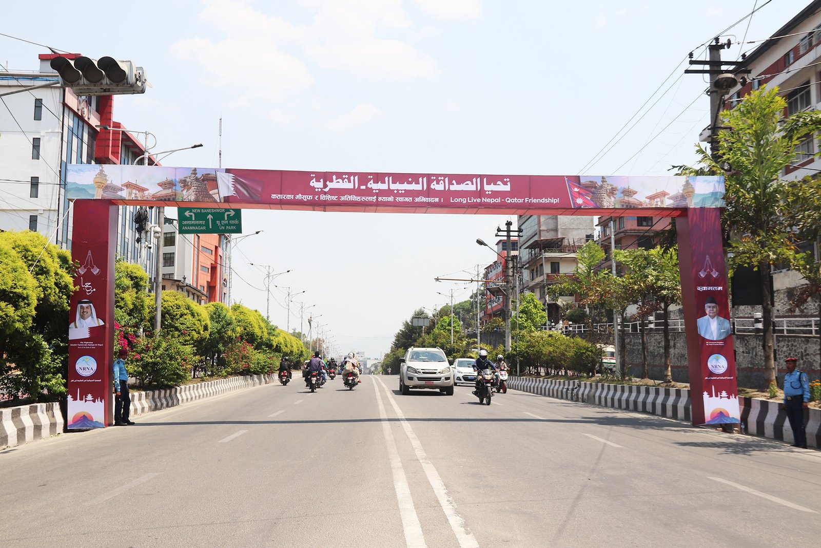 काठमाडौँ । कतारका अमिर शेख तमिम बिन हमाद अल थानीको स्वागतका लागि सङ्घीय राजधानी काठमाडौँ सिँगारिएको छ । कतारका अति विशिष्ठ पाहुनाको स्वागतका लागि काठमाडौँको मुख्य सडक, चोकमा स्वागतद्वार, तुल ब्यानरसहित चिटिक्क पारिएको हो ।