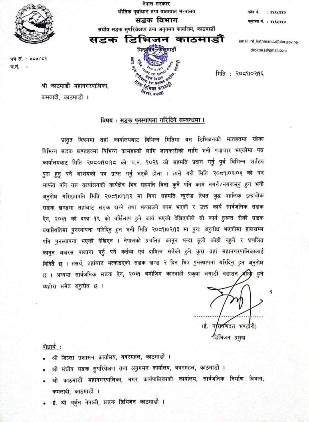 सडक डिभिजनले महानगरपालिकालाई पत्र लेख्दै न्यूरोडस्थित जुद्ध शालिक इन्द्रचोक सडकखण्डमा भत्काइएको सडक दुई दिनभित्र पुनःस्थापना गर्न र नगरे कारबाही गर्ने चेतावनी दिएको हो ।