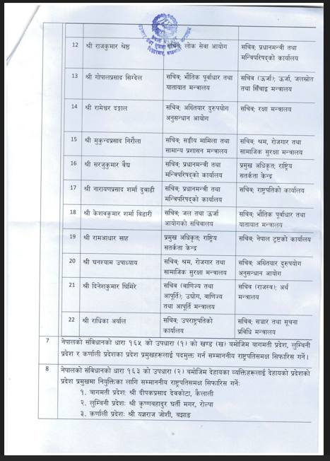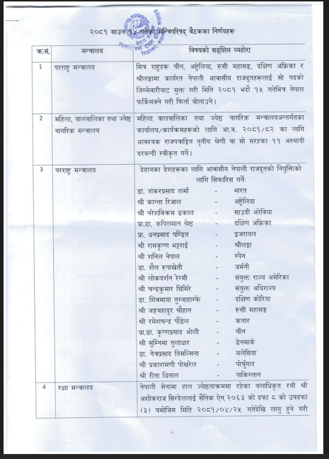 उनकाअनुसार मन्त्रिपरिषद बैठकले ५ देशका राजदूत फिर्ता, १८ देशमा राजदूत नियुक्ति सिफारिस र २२ सचिवहरूको सरुवा गर्ने निर्णय गरेको छ ।