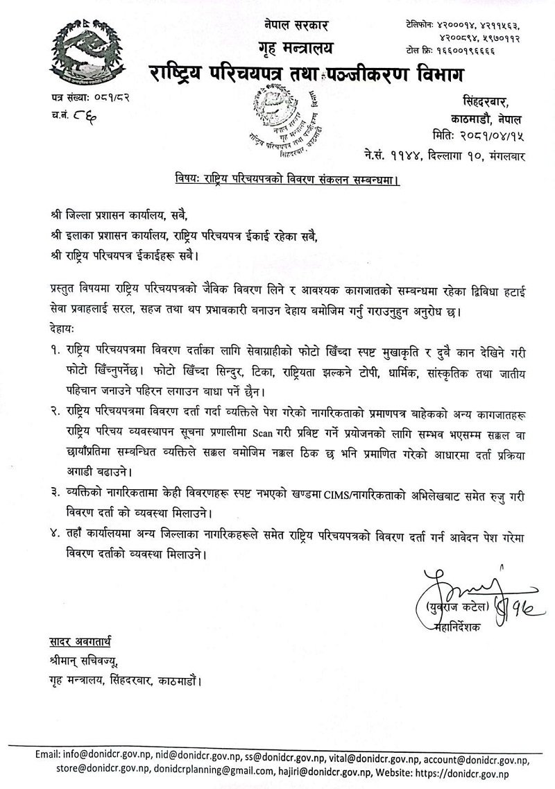 विभागले सबै जिल्ला प्रशासन कार्यालयलाई परिपत्र गर्दै राष्ट्रिय परिचयपत्रका लागि तस्बिर खिच्दा आफ्नो संस्कृति र जातीय पहिचान जनाउने पोशाक र पहिरन लगाउन मिल्ने जनाएको हो । यसअघि राष्ट्रिय परिचयपत्रका लागि तस्बिर लिँदा सिन्दूर, टीका हटाउन लगाउने गरेको थियो । सरकारको यो निर्णयको सर्वत्र विरोध भएको थियो ।