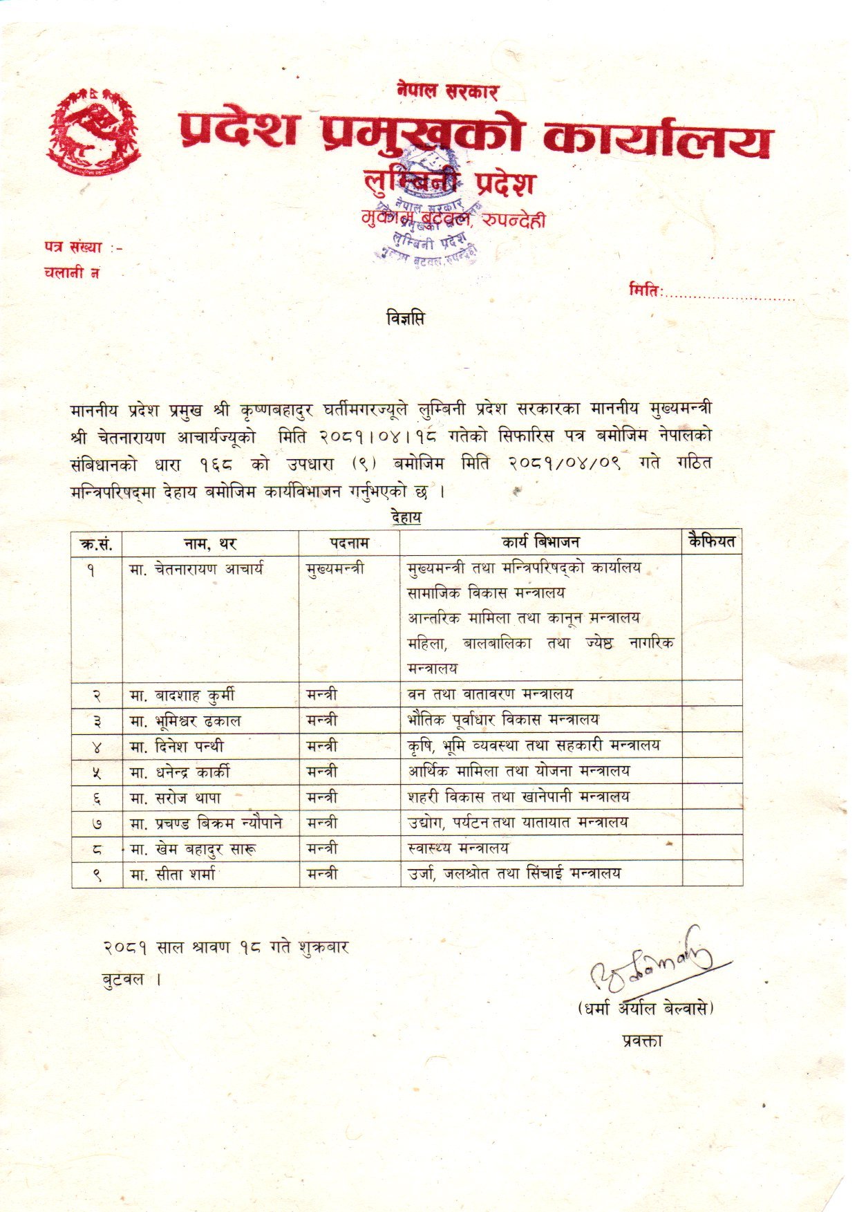 १२ मन्त्रालय रहेको लुम्बिनीमा एमालेले मुख्यमन्त्रीसहित पाँच, कांग्रेसले चार र दुई साना दललाई मन्त्रालय बाँडफाँट गरिएको थियो । आन्तरिक मामिला तथा कानुन मन्त्रालय, सामाजिक विकास मन्त्रालय र महिला तथा बालबालिका मन्त्रालयको जिम्मेवारी मुख्यमन्त्री आफैँले राखेका छन् ।