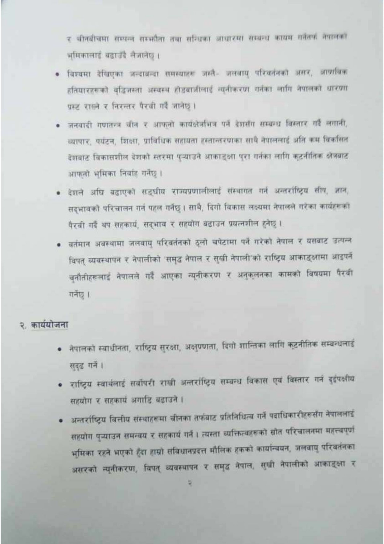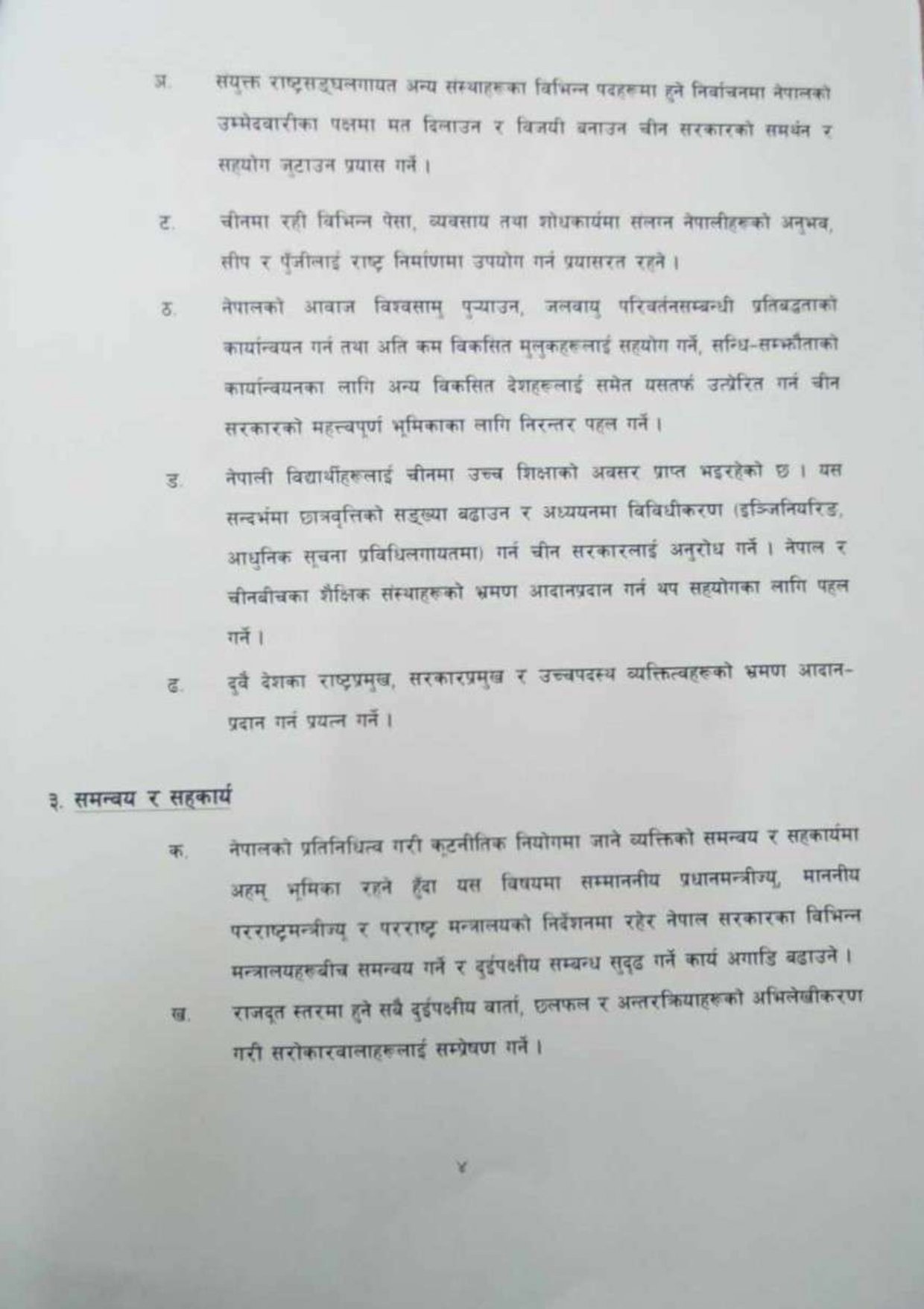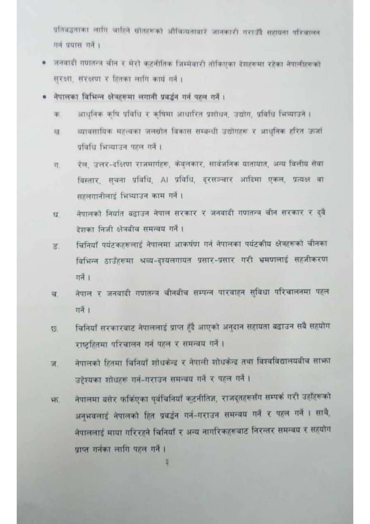 यसैगरी अन्तर्राष्ट्रिय वित्तीय संस्थाहरूमा चीनका तर्फबाट प्रतिनिधित्व गर्ने पदाधिकारीहरूसँग नेपाललाई सहयोग पुर्याउन समन्वय र सहकार्य गर्ने पनि उनको कार्ययोजनामा उल्लेख छ । त्यस्तै चीन सरकारले अगाडि सारेको परियोजना बेल्ट एन्ड रोड इनिसियटिभ (बीआरआई) बारे सरकारले लिने नीति कार्यान्वयन गर्ने उल्लेख गरेका छन् ।