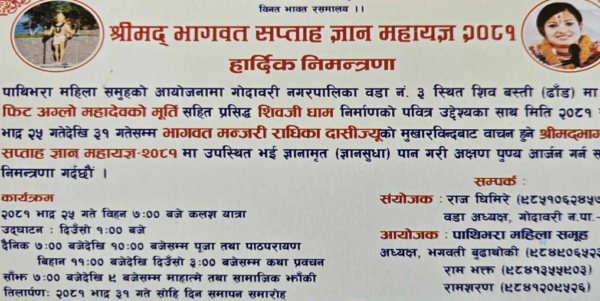 ललितपुर । ललितपुरको गोदावरी नगरपालिका वडा नम्बर ३ स्थित शिव बस्ती (ढाँड) मा श्रीमद् भागवत सप्ताह ज्ञान महायज्ञ लगाइने भएको छ । पाथीभरा महिला समुहको आयोजनामा शिव बस्तीमा श्रीमद्भागवत महायज्ञ लगाउन लागिएको मुल समारोह समितिका संयोजक एवं वडा अध्यक्ष राज घिमिरेले जानकारी दिए ।