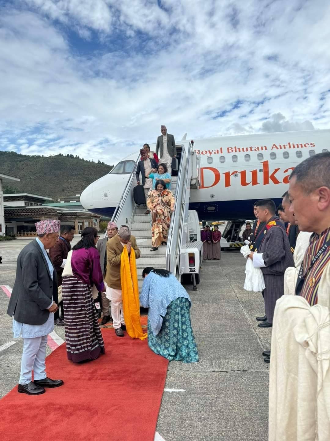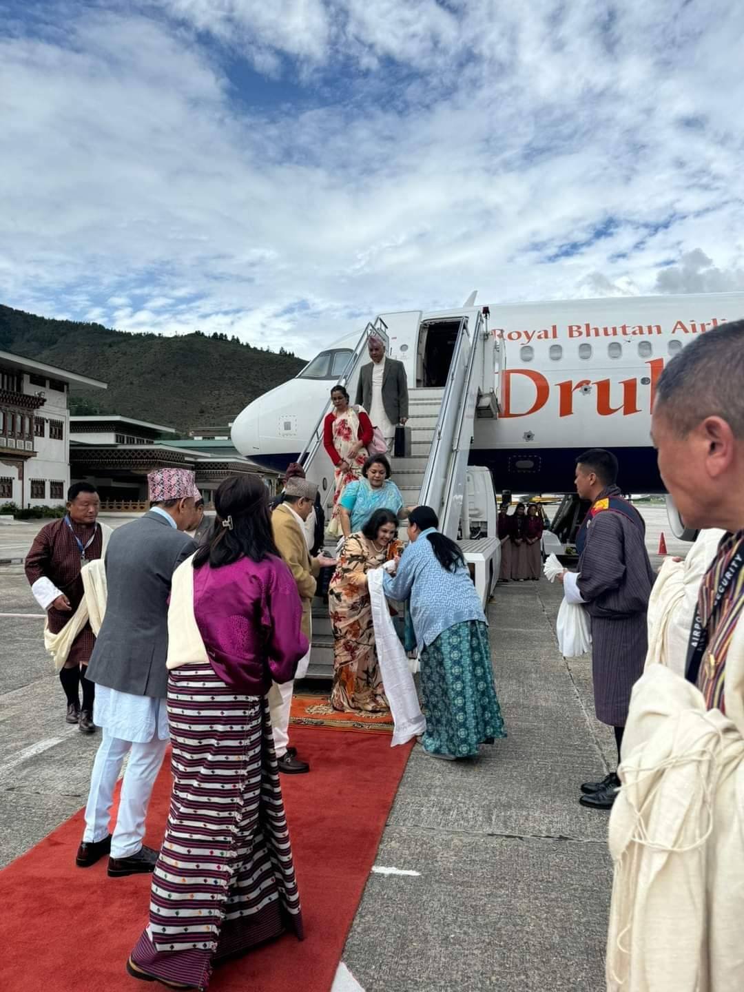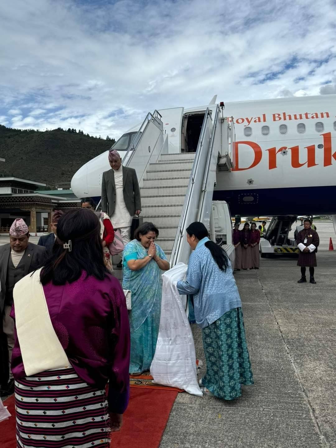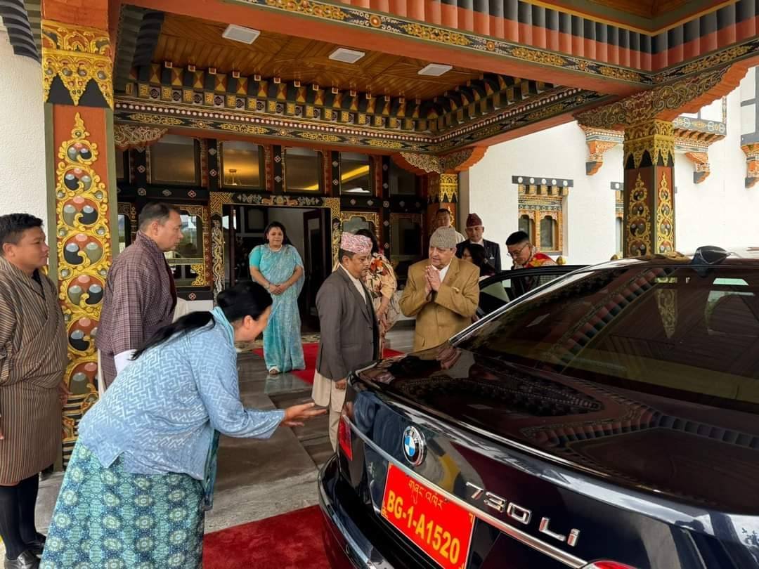 उनलाई थिम्पु विमानस्थलमा भुटानकी राजकुमारीले स्वागत गरेकी थिइन् भने विमानस्थलमा स्वागतका लागि रातो कार्पेट बिछ्याइएको थियो । भ्रमण टोलीमा पूर्वराजासँग छोरी प्रेरणा र भतिजी शिताष्मा पनि छिन् ।