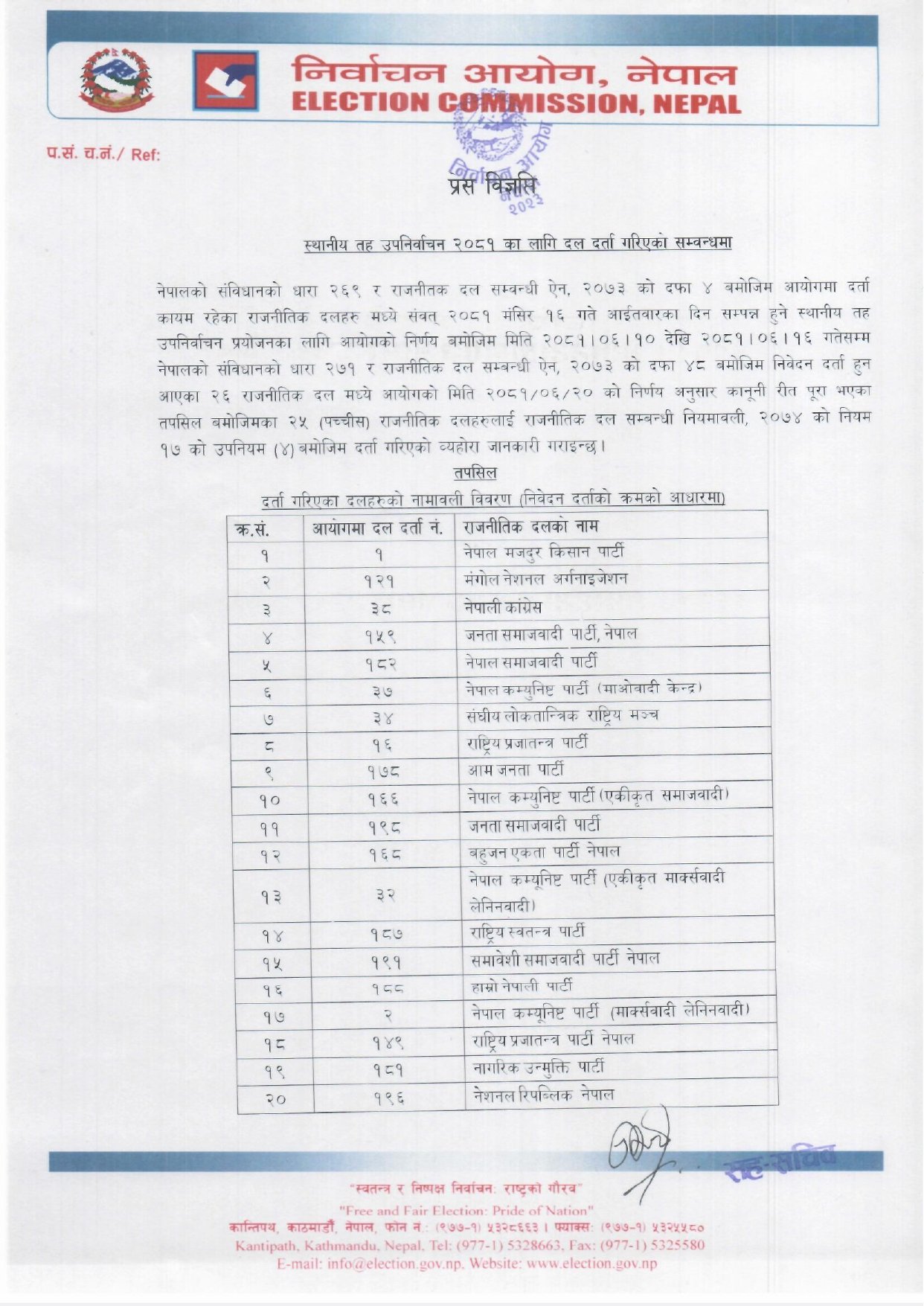 काठमाडौं । आगामी मंसिरमा हुने उपनिर्वाचनका लागि २५ दल दर्ता भएका छन् । निर्वाचन आयोगले आइतबार विज्ञप्ति जारी गरी १६ मंसिरमा हुने उपनिर्वाचनका लागि २५ दल दर्ता भएका जानकारी दिएको हो । मांसिर १६ मा स्थानीय तहका रिक्त प्रमुख, उपप्रमुख र वडा अध्यक्षका लागि उपनिर्वाचन हुँदैछ ।