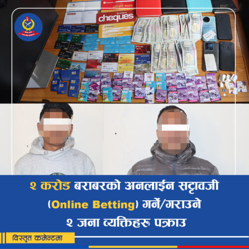 काठमाडौँ । प्रहरीले दुई करोड बराबरको अनलाइन जुवा खेलाएको (सट्टेबाजी गराएको) अभियोगमा दुई जनालाई पक्राउ गरी सोमबार सार्वजनिक गरेको छ ।