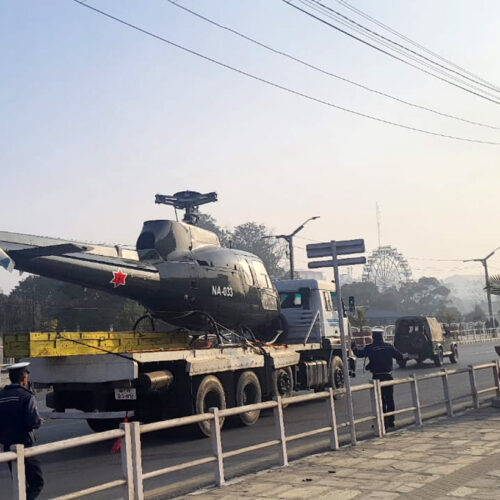 नेपाली सेनाको हेलिकप्टर ट्रकमा राखेर सेनाको मुख्यालय भद्रकालीबाट त्रिभुवन विमानस्थलस्थित सेनाको हवाइ महानिर्देशनालयमा लगिँदै । सेना दिवसको अवसरमा सैनिक मुख्यालय भद्रकालीमा आयोजित प्रदर्शनीका लागि सो हेलिकप्टर ल्याइएको थियो ।
