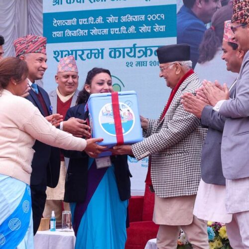 बालुवाटरस्थित शिवपुरी उच्च माध्यामिक विद्यालयमा मंगलबार आयोजित एक कार्यक्रममा काठमाडौँ महानगरपालिका–३ स्वस्थ्यकर्मीलाई खोपसामग्री प्रदान गरेर अभियानको शुभारम्भ गरे ।