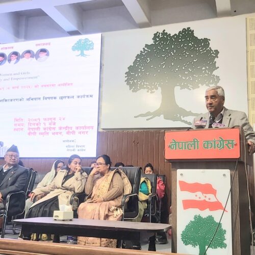११५औँ अन्तरराष्ट्रिय नारी दिवसका अवसरमा नेपाली कांग्रेसको केन्द्रीय महिला विभागद्वारा शनिबार पार्टी केन्द्रीय कार्यालय सानेपामा आयोजित ‘नेपाली महिलाको आह्वानः समानता र सशक्तीकरणको अभियान’ विषयक छलफल कार्यक्रममा सभापति देउवाले नेपालमा अधिकारका माध्यमबाट महिलाको उत्थान र अधिकार मात्रै हैन जिम्मेवारी दिने सवालमा पनि विश्वका अरू देशभन्दा अग्रगामी रहेको जिकिर गरे।