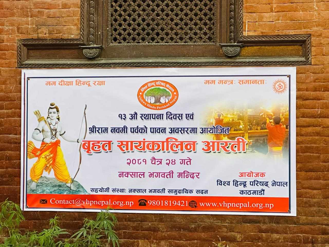 काठमाडौं । नक्साल भगवती मन्दिर परिसरमा आइतबार साँझ सायंकालीन आरती गरिएको छ । श्रीराम नवमी तथा विश्व हिन्दू परिषद नेपालको १३ औं स्थापना दिवसको अवसरमा सायंकालीन आरती गरिएको हो । कार्यक्रममा परिषदका आवद्ध महानुभावका साथै स्थानीयकोसमेत उपस्थिति रहेको थियो ।