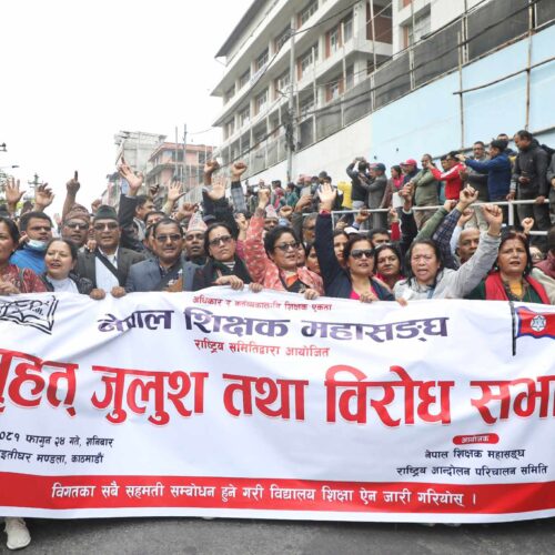 महासंघको विज्ञप्तिमा भनिएको छ, ‘विगतका सहमति कार्यान्वयन गर्ने सन्दर्भमा मन्त्रिपरिषदको निर्णयबाट सम्बोधन हुनसक्ने विषयमा शीघ्रातीशीघ्र निर्णय लिँदै ऐन जारी गर्नका लागि माथि प्रस्तावित विकल्पबारे स्पष्टताका साथ पहल भएमा वार्ताको विश्वसनीय वातावरण निर्माण हुने भएकाले त्यस्तो अवस्थामा मात्र महासंघ वार्तामा बस्न सक्ने कुरा स्पष्ट गर्दै विज्ञप्ति मार्फत् आह्वान भएको अहिलेको वार्तामा बस्नुको कुनै औचित्य नरहेको समेत प्रष्ट्याउन चाहान्छौं ।’ विद्यालय शिक्षा ऐन जारी गर्न माग गर्दै देशभरका शिक्षक चैत २० गतेदेखि काठमाडौं केन्द्रित आन्दोलनमा छन् ।