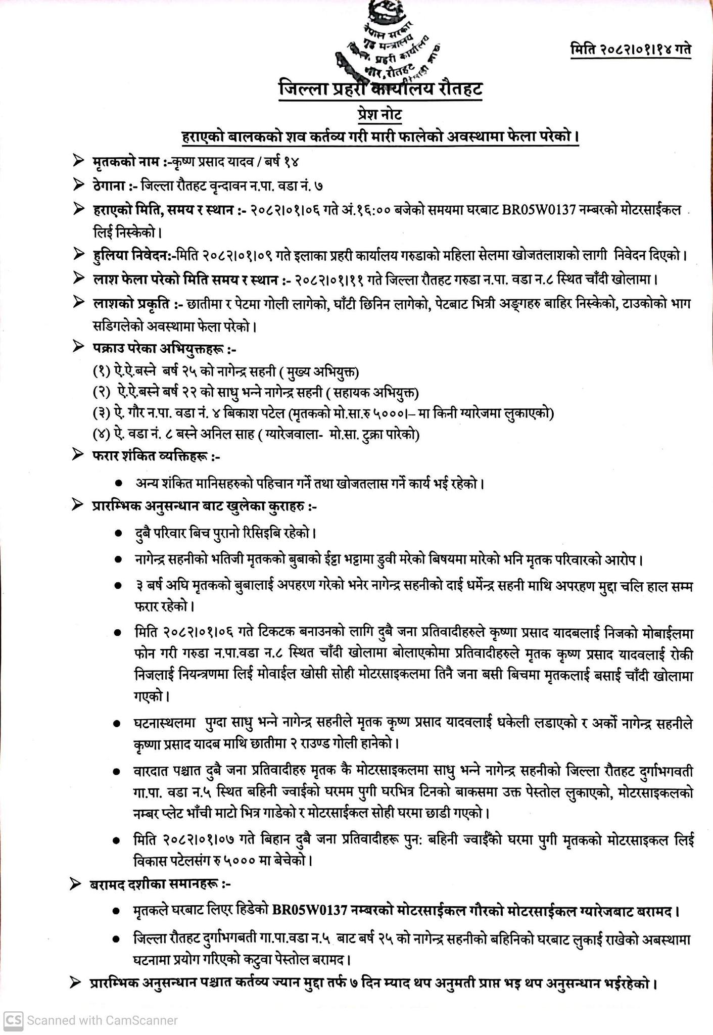 रौतहट । रौटहटमा टिकटक बनाउन बोलाएर एक बालकको गोली हानी हत्या भएको छ । वैशाख ६ गते रौतहटको वृन्दावन नगरपालिका–७ का बालक कृष्णप्रसाद यादवलाई टिकटक बनाउने भन्दै मोबाइलमा फोन गरेर बोलाइ हत्या भएको पाइएको हो ।