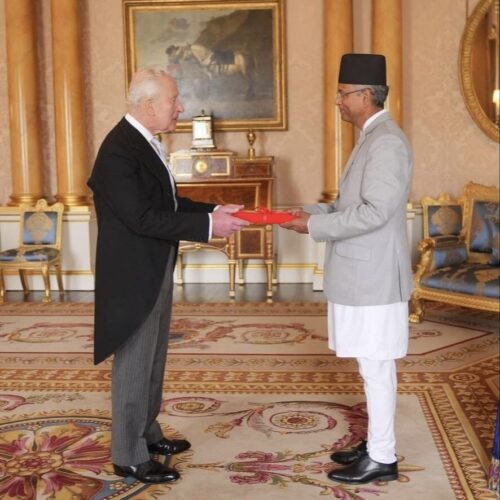काठमाडौं। संयुक्त अधिराज्यका लागि नेपालका राजदूत चन्द्रकुमार घिमिरेले राजा चाल्र्स तृतीयसमक्ष आफ्नो ओहोदाको प्रमाणपत्र प्रस्तुत गरेका छन्। बकिंघम राजप्रासादमा बिहीबार अपराह्न आयोजित विशेष समारोहमा उनले आफ्नो ओहोदाको प्रमाणपत्र प्रस्तुत गरेका हुन्।