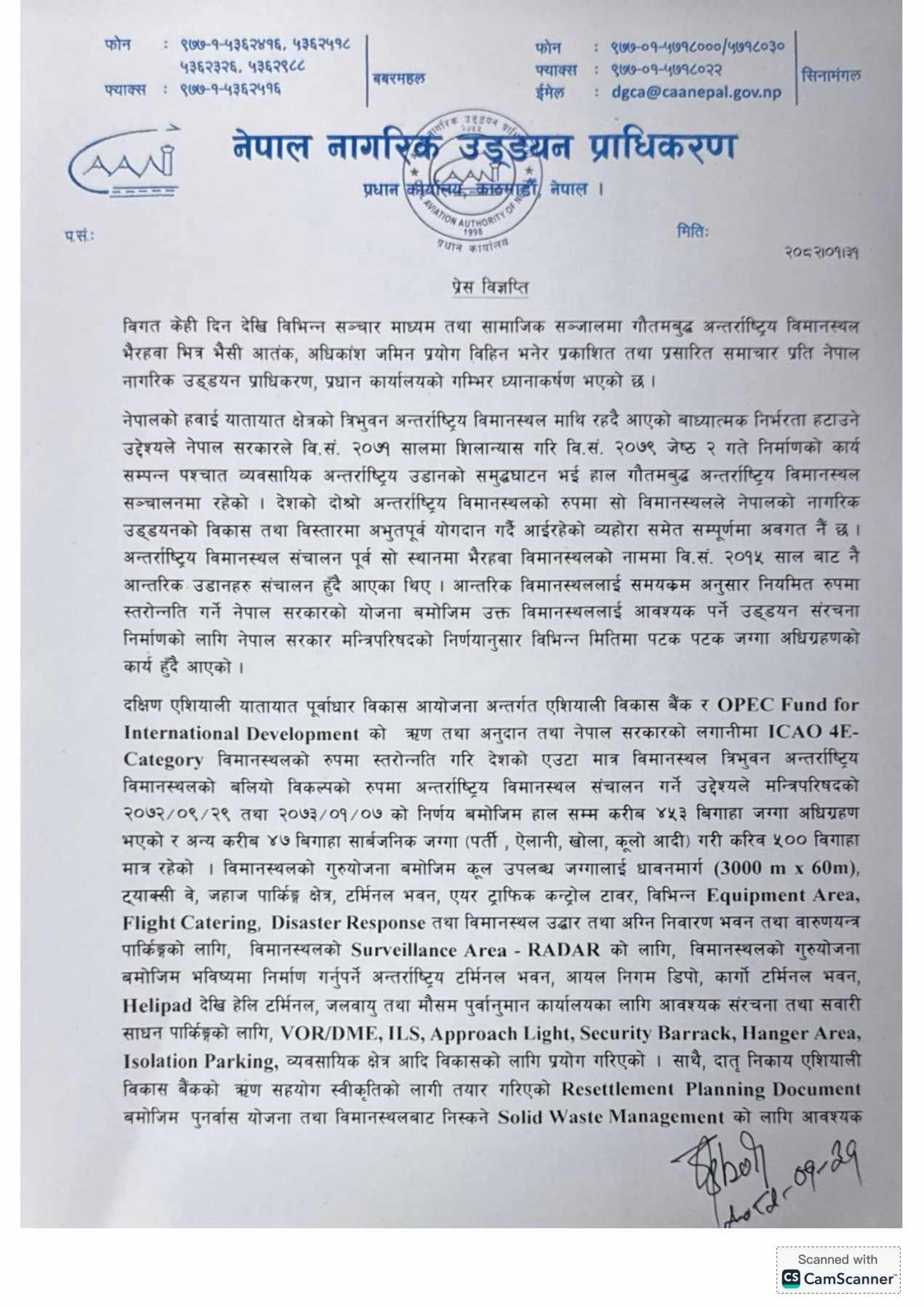 विभिन्न सञ्चारमाध्यममा गौतमबुद्ध अन्तर्राष्ट्रिय विमानस्थल भैरहवा भित्र भैसी आतंकका विषयमा समाचार प्रकाशित भएपछि प्राधिकरणले विज्ञप्ति जारी गरी यसबारे जानकारी गराएको हो ।