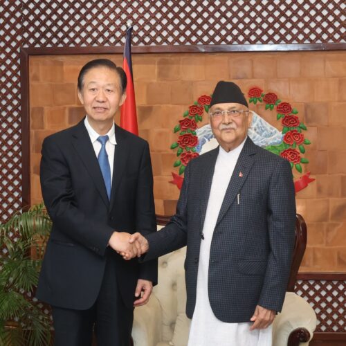 काठमाडौँ । प्रधानमन्त्री केपी शर्मा ओलीसँग नेपाल भ्रमणमा रहेका चिनियाँ जनकंग्रेसको स्थायी समितिका उपाध्यक्ष सिआओ ची नेतृत्वको प्रतिनिधिमण्डलले शिष्टाचार भेट गरेको छ ।