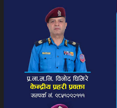 काठमाडौं । नेपाल प्रहरीको प्रवक्ताको जिम्मेवारी प्रहरी नायव महानिरीक्षक (डीआईजी) विनोद घिमिरेलाई दिइएको छ । प्रहरी प्रधान कार्यालय बिहीबार सूचना जारी गरी घिमिरेलाई केन्द्रीय प्रवक्ताको जिम्मेवारी दिएको बताएको हो ।