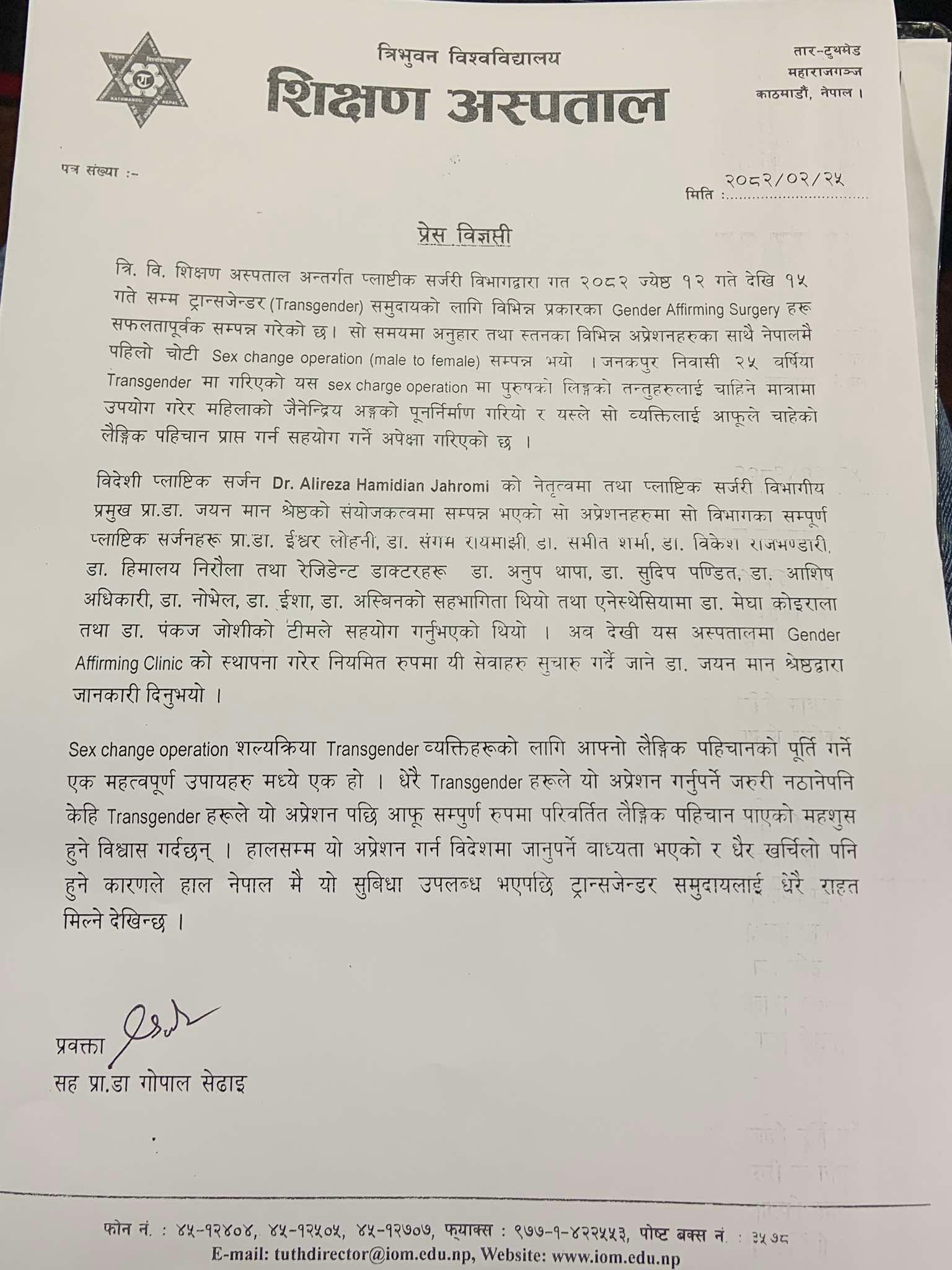 प्लास्टिक सर्जरी विभागद्वारा सफलतापूर्वक शल्यक्रिया भएको हो । त्यसक्रममा अनुहार तथा स्तनका विभिन्न शल्यक्रियासमेत भएको थियो । जन्मँदा लिंग पुरुष भएका ती व्यक्तिको लिंग परिवर्तन गरी महिला बनाइएको हो । जनकपुरनिवासी ती २५ वर्षीया ट्रान्सजेन्डरमा गरिएको शल्यक्रियाका क्रममा पुरुषको लिंगको तन्तुहरूलाई चाहिने मात्रामा उपयोग गरेर महिलाको जैनेन्द्रिय अंगको पुनर्निर्माण गरिएको प्लास्टिक सर्जरी विभाग प्रमुख जयनमान श्रेष्ठले जानकारी दिए ।