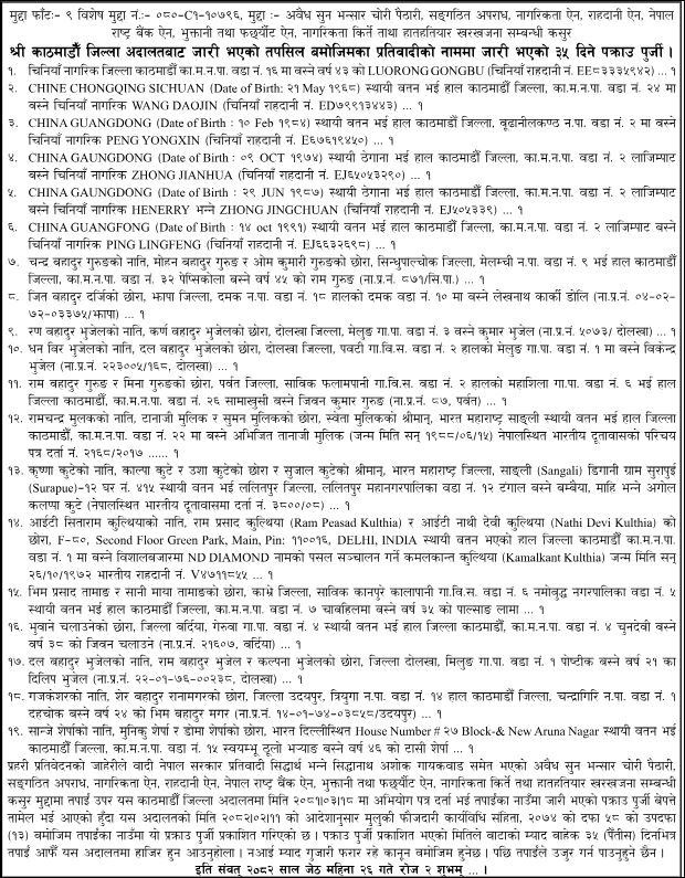 सोमबार अदालतले १९ जनाविरूद्ध पक्राउ पुर्जी जारी भएको तर अहिलेसम्म पनि मुद्दाको सुनुवाइमा नआएको भन्दै ३५ दिनको सूचना जारी गरेको हो । अदालतले चिनियाँ नागरिकहरू लुरोङ गोङ्बु, वाङ दाओजिङ, पेङ योङसिन, झोङ जियानहुवा, हेनेरी भन्ने झोङ जिङचुआन र पिङ लिङफेङविरुद्ध पक्राउ पुर्जी जारी भएको छ ।