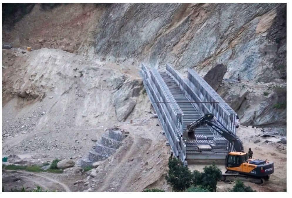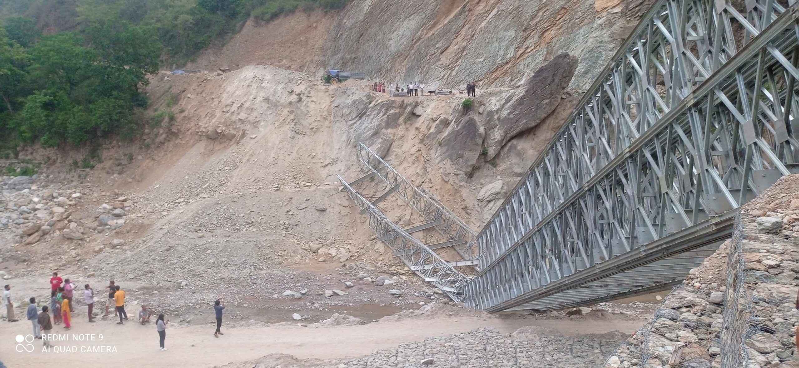 पाँचथर । मेची राजमार्गमा पर्ने फिदिम र हिलिहाङ जोड्ने हेवाखोलामा निर्माणाधीन बेलिब्रिज शनिबार साँझ भाँचिएको छ । ७० मिटर लामो सिङ्गल स्पानको बेलिब्रिज जडान गरी वारपार गर्ने क्रममा भाँचिदा ६ जना मजदुर घाइते भएका छन् । नेपालमा नयाँ भएकाले भारतीय प्राविधिकको सहयोगमा जडान कार्य भइरहेको थियो ।