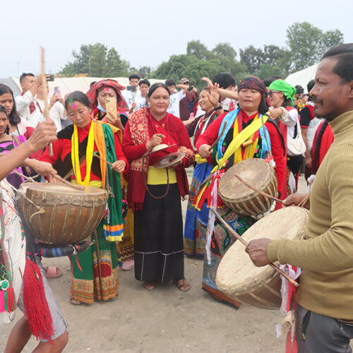 काठमाडौँ टुँडिखेलमा आइतबार भूमे पर्व संरक्षण नेपालले आयोजना गरेको भूमे पर्व कार्यक्रममा भूमे नाचगान प्रस्तुत गर्दै मगर समुदायका । तस्बिरः हरिराम भेटुवाल/रासस