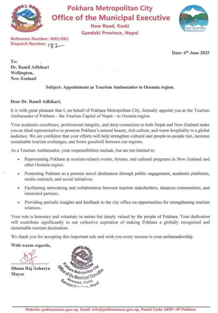 न्युजिल्याण्डस्थित नेपाली समुदायबीच सक्रिय र शैक्षिक तथा पेशागत क्षेत्रमा ख्यातिप्राप्त डा. अधिकारीलाई औपचारिक नियुक्तिपत्र प्रदान गर्दै महानगरले पोखराको प्राकृतिक सौन्दर्य, सांस्कृतिक सम्पदा र आतिथ्य संस्कृतिको विश्वव्यापी प्रवद्र्धनमा योगदान हुने विश्वास व्यक्त गरेको छ ।