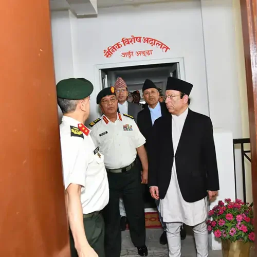 काठमाडौँ । प्रधानन्यायाधीश प्रकाशमान सिंह राउतले सर्वोच्च अदालतबाट न्यायिक निकायहरुको नियमित निरीक्षणको सिलसिलामा बिहीबार सैनिक विशेष अदालतको निरीक्षण भ्रमण गरेका छन् ।
