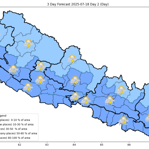आज दिउँसो देशभर आंशिकदेखि साधारणतया बदली रहनेछ । कोशी, बागमती, गण्डकी र सुदूरपश्चिम प्रदेशलगायत बाँकी प्रदेशका पहाडी भू–भागका केही स्थानहरूमा तथा बाँकी भू–भागका थोरै स्थानहरूमा मेघगर्जन/चट्याङसहित हल्कादेखि मध्यम वर्षाको सम्भावना रहेको छ । देशको उच्च–पहाडी तथा हिमाली भू–भागका थोरै स्थानहरूमा हल्कादेखि मध्यम वर्षा/हिमपातको सम्भावना रहेको छ ।