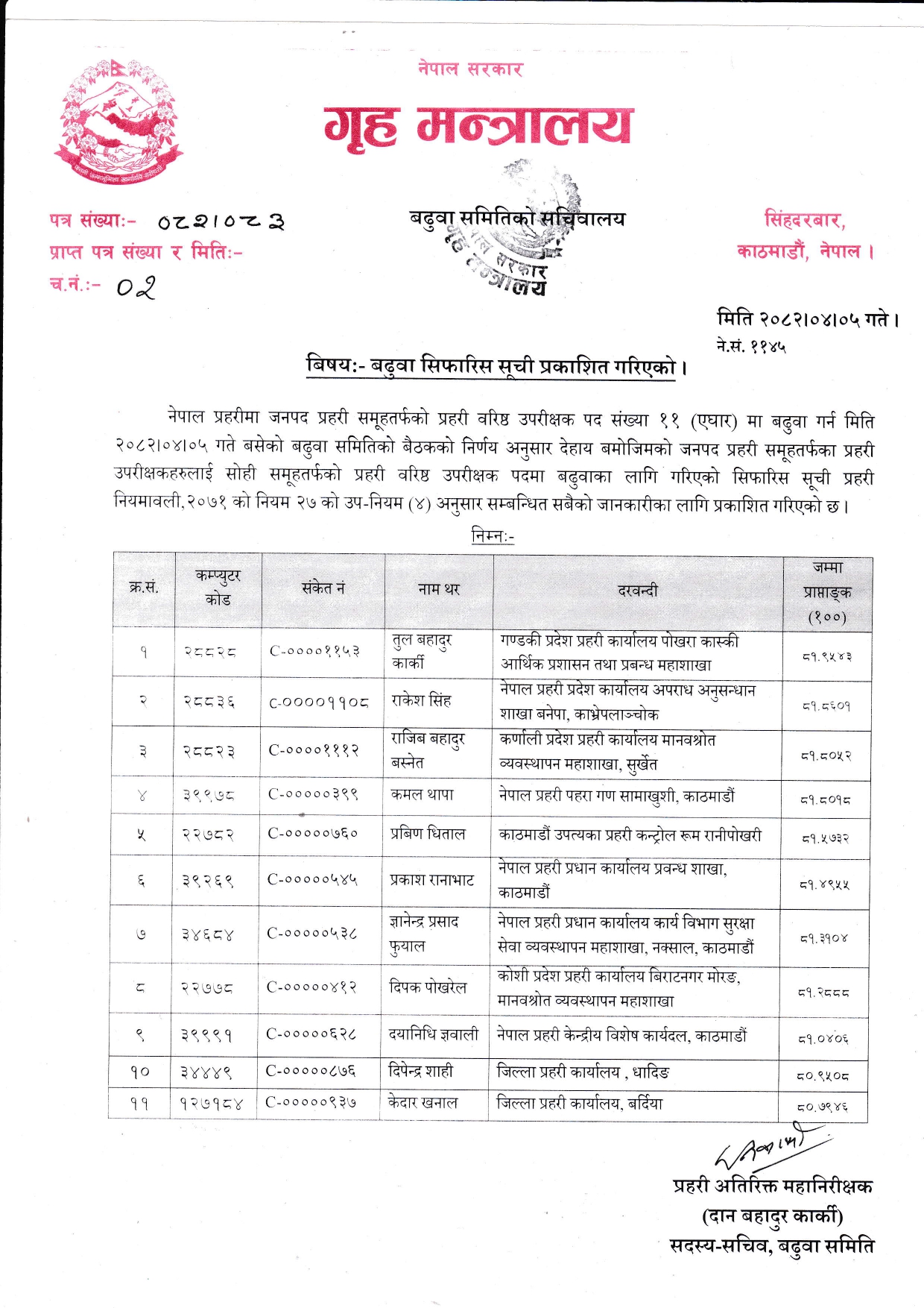 बैठकले तुलबहादुर कार्की, राकेश सिंह, कमल थापा, दयानिधी ज्ञवाली, दीपक पोखरेल, प्रवीण धिताल, राजीब बस्नेत, दीपेन्द्र शाही, प्रकाश रानाभाट, केदार खनाल र ज्ञानेन्द्रप्रसाद फुयालको बढुवा सिफारिस गरेको हो ।