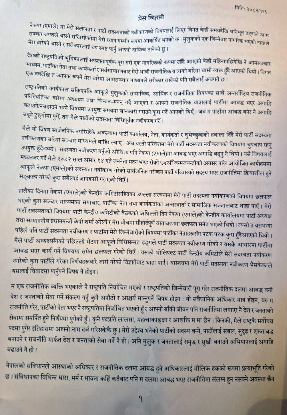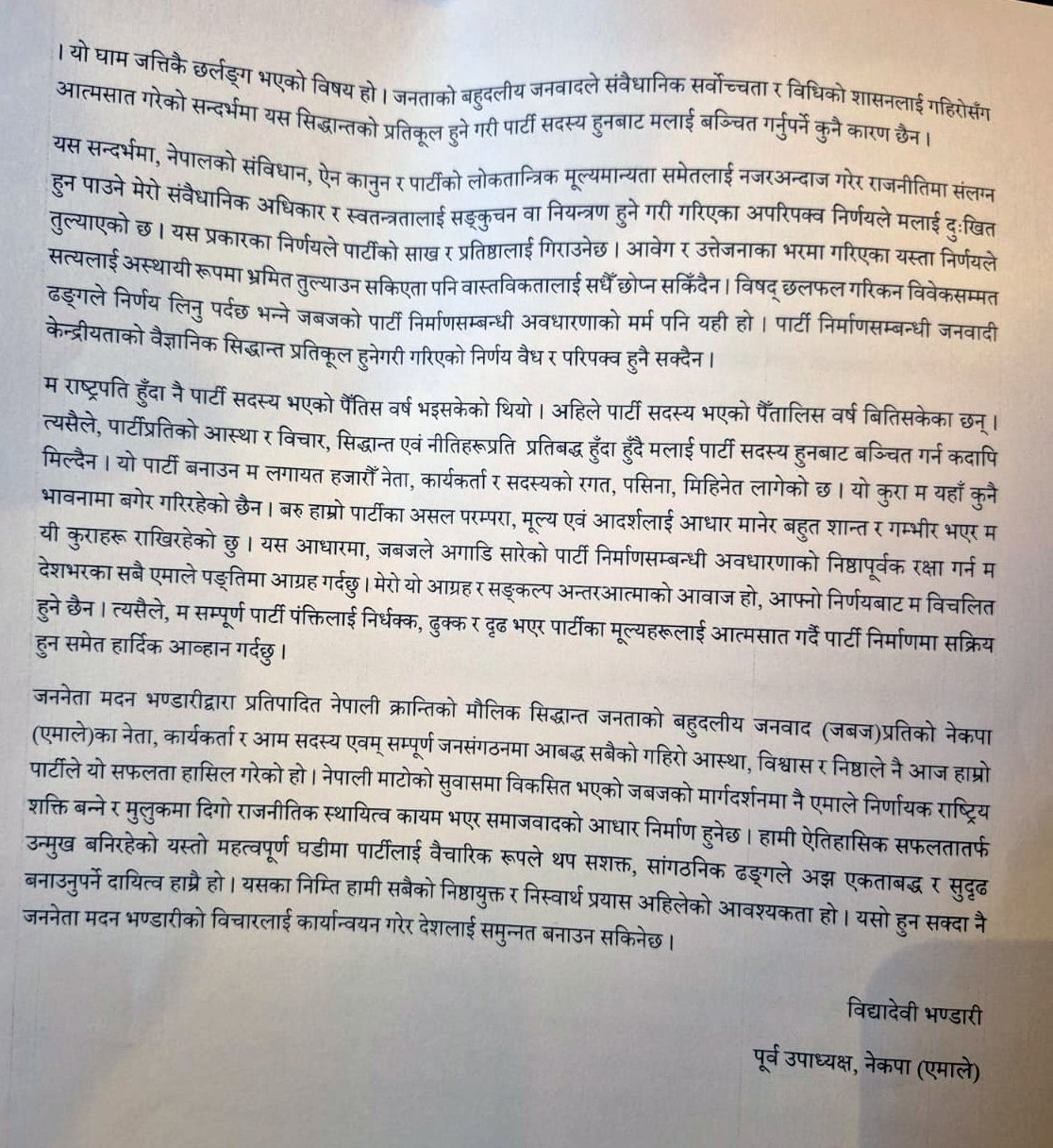 पूर्वराष्ट्रपति भण्डारीले आफूले राष्ट्रपति हुँदा नै पार्टी सदस्यता लिएको ३५ वर्ष भइसकेको उल्लेख गर्दै अहिले ४५ वर्ष पुगेको उल्लेख गरिन् । उनले भनिन्, ‘ म अहिले पनि एमालेकै परिवारमा आवद्ध छु । कसैलाई लाग्यो भन्दैमा मेरो सदस्यता फाल्न सक्दैन । मैले अघिल्लै वर्ष सदस्यता नवीकरण गरेकी छु । यो घाम जत्तिकै छर्लंग भएको कुरा हो। मलाई पार्टी सदस्य हुनबाट बन्चित गर्नुपर्ने कुनै कारण छैन। ऐन कानुन र पार्टीको मूल्यान्यता, मेरो स्वतन्त्रता नियन्त्रण हुने गरी गरिएको निर्णयले मलाई दुःखित तुल्याएको छ। यसले पार्टीको शाख गिराउनेछ। सत्यलाई अस्थायी रुपमा छेक्न सके पनि सत्यलाई लुकाउन सकिँदैन। जनवादको मूल्यमान्यता पनि यही हो।’