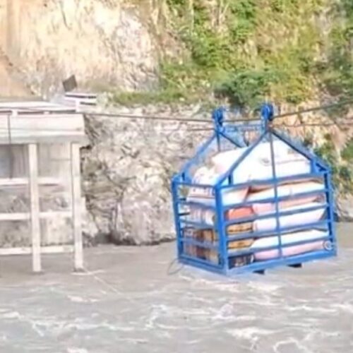 बाढीले फोक्सिङटारको मोटरेबल पुल बगाएपछि सामान ढुवानी गर्न घिर्नी
